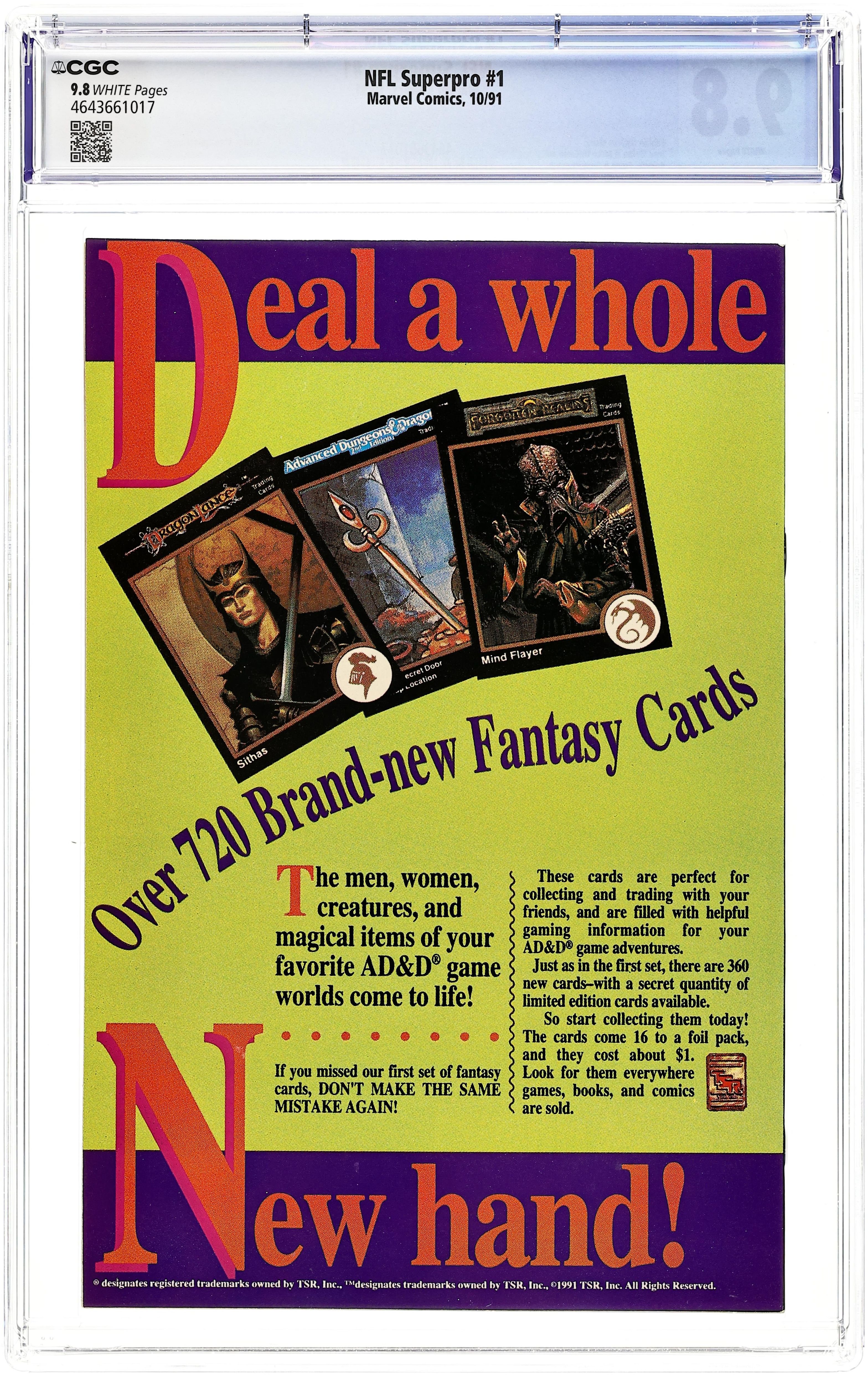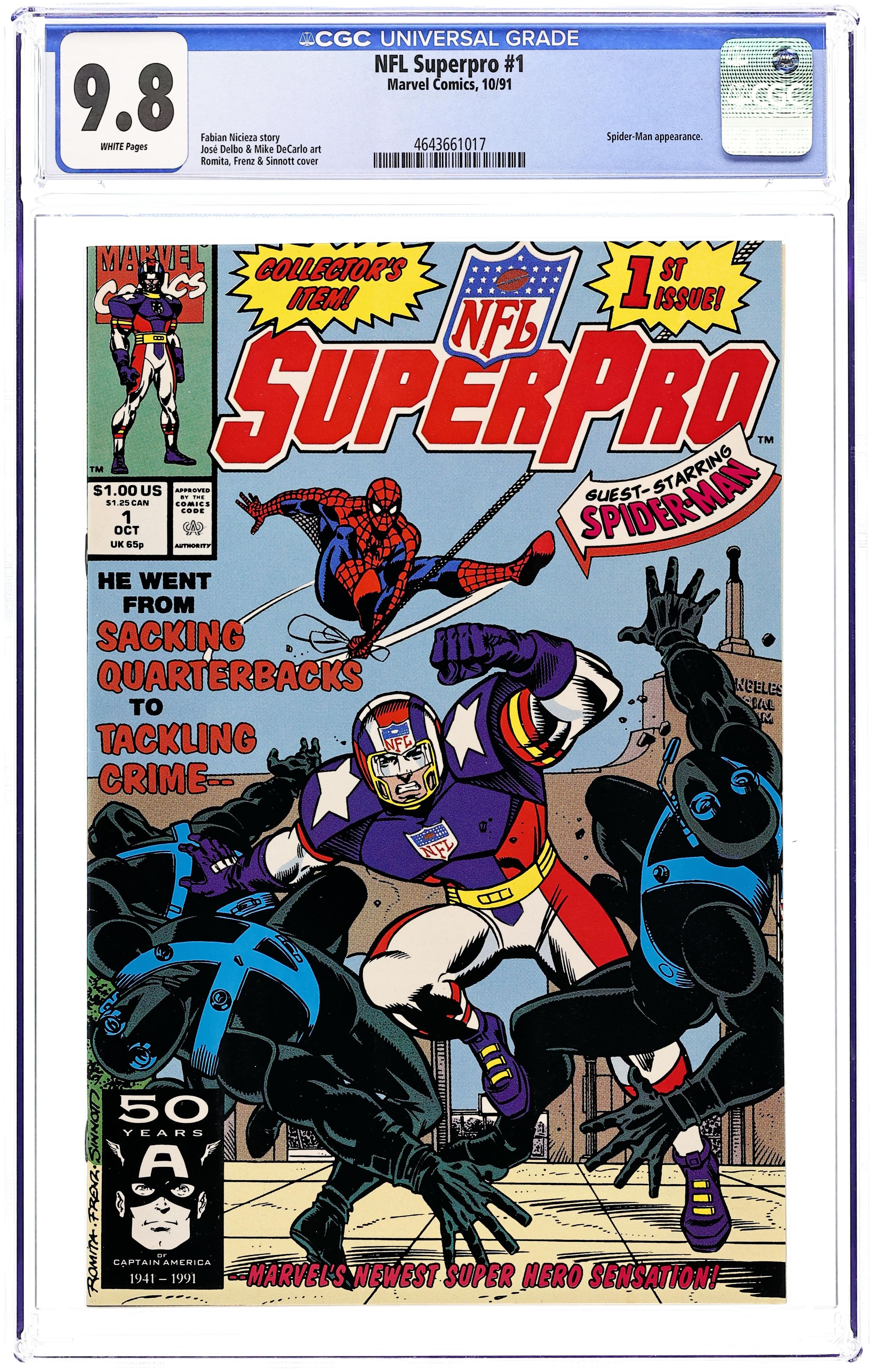 Cover pencils by John Romita and Ron Frenz, inks by Joe Sinnott. "You Bet Your Life," script by Fabian Nicieza, pencils by Jose Delbo, inks by Mike DeCarlo; SuperPro fights mobsters in order to clear the name of a friend who's been accused of gambling on the game; Spider-Man backs him up surreptitiously; Includes a flashback with the origin of SuperPro, involving a chemical accident and an experimental football uniform. 40 pgs., full color. Cover price $1.00.