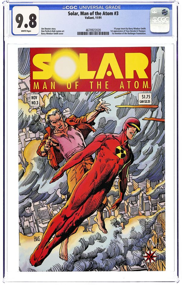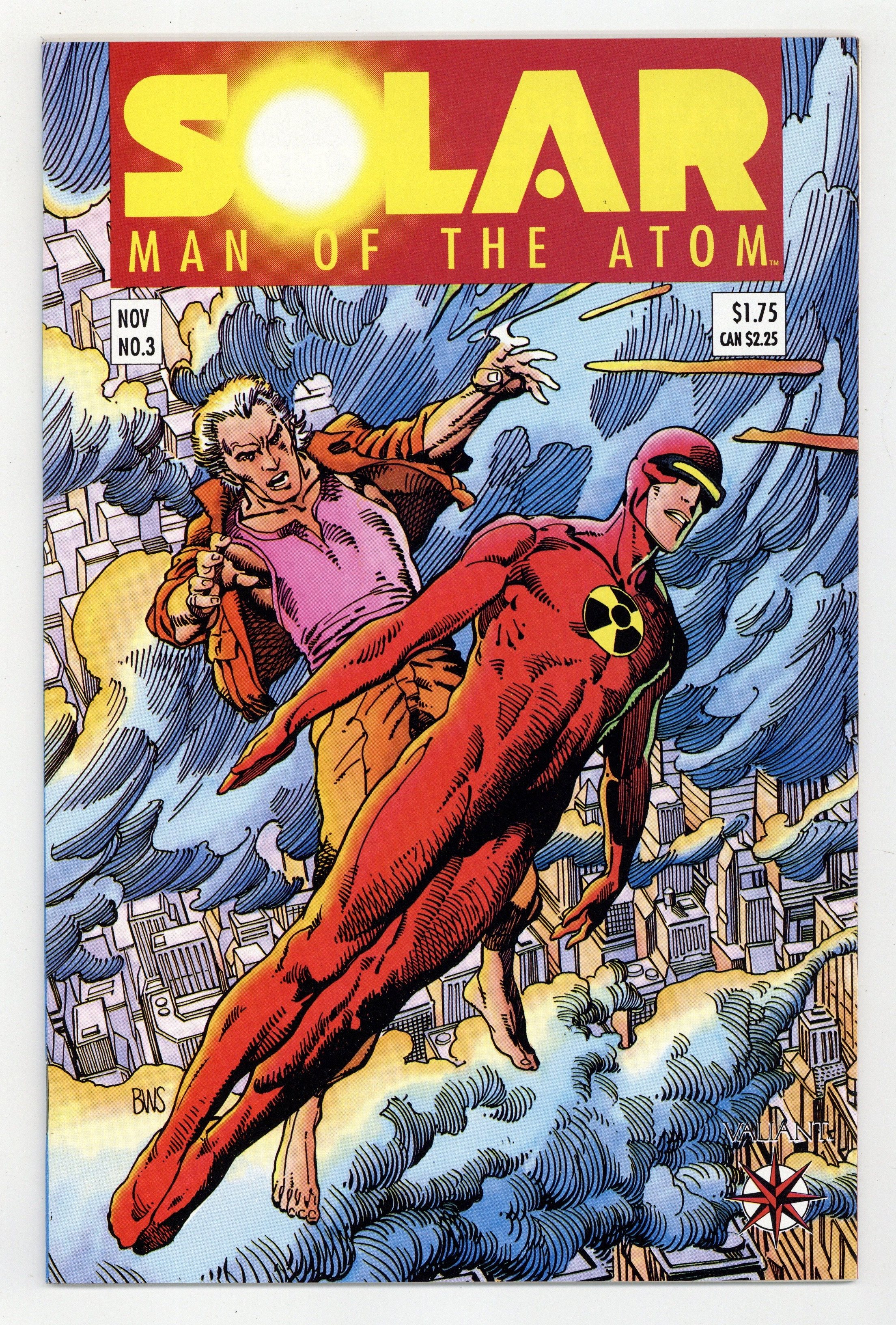 $12.75Dr. Solar Man of the Atom tries to find a place in the world for someone like himself and goes to the Harbinger Foundation in "Second Death Part Three – Reality Check." Script by Jim Shooter and art by D. David Perlin & Bob Layton & Thomas Ryder. Issue also has part three of "Alpha and Omega," a 10-part origin story of Solar Man of the Atom with script by Jim Shooter and art by Barry Windsor-Smith and Bob Layton. Each chapter of the origin story has a two-page pinup. When all 10 two-page pinups are put together, they form a gigantic page of the climax of the origin story. Cover by Barry Windsor Smith. This issue does not have a card (coupon). Cover price $1.75.