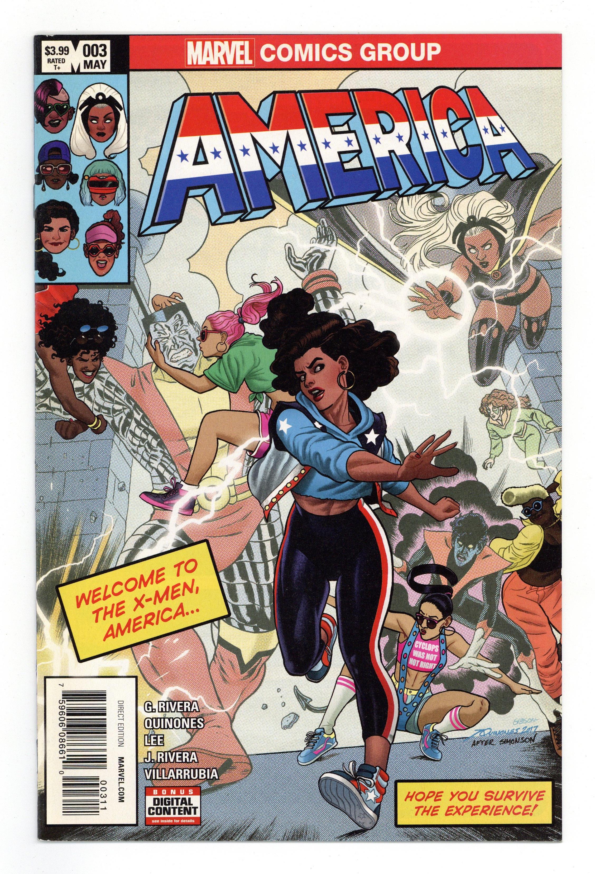 $3.00Written by Gabby Rivera. Art by Joe Quinones and Stacy Lee. Cover by Joe Quinones. WELCOME TO THE X-MEN, AMERICA - HOPE YOU SURVIVE THE EXPERIENCE! The fate of Lisa Halloran lies in the hands of America Chavez super fans! And they don't take kindly to rejection… America will have to punch her way in to save her girlfriend, but when a jump goes wrong, she ends up stuck in the past! Can that era's Storm and the X-Men help her find her way, or are they too busy protecting a world that hates and fears them? But all that's just the glitter on top. Who is the shadowy figure watching America's every move? 28 pages, full color. Rated T+ Cover price $3.99.