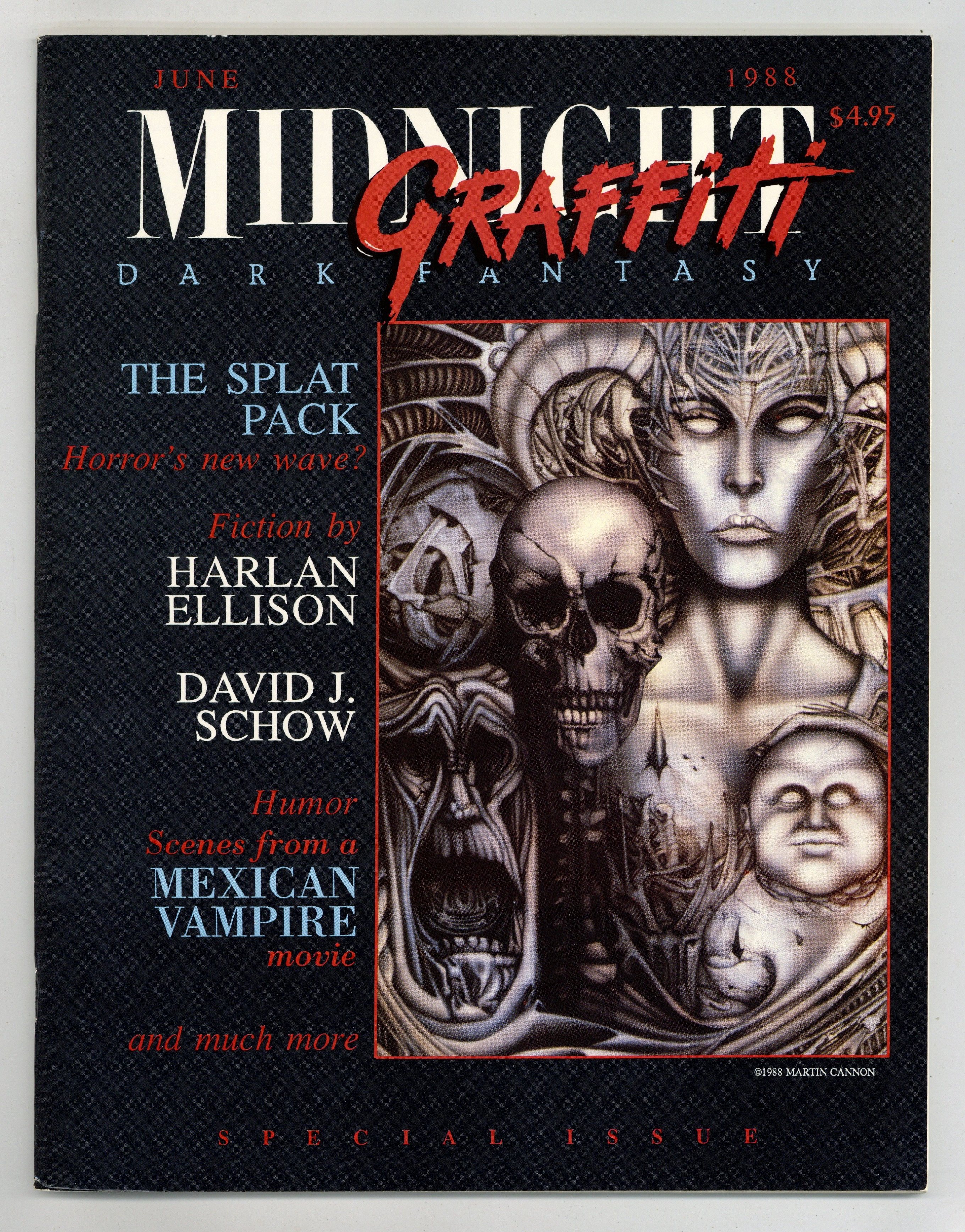 Published Jun 1988 by Midnight Graffiti Publish.$11.25This issue includes the following: fiction by Harlan Ellison and David J. Schow; a Ouija Board "interview" with L. Ron Hubbard; a piece on young horror writers; an art gallery of Allen Koszowski; book and comics reviews; and more. Cover art by H. R. Giger. Cover price $4.95.
