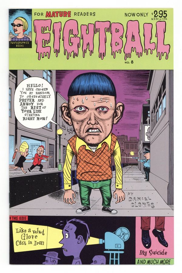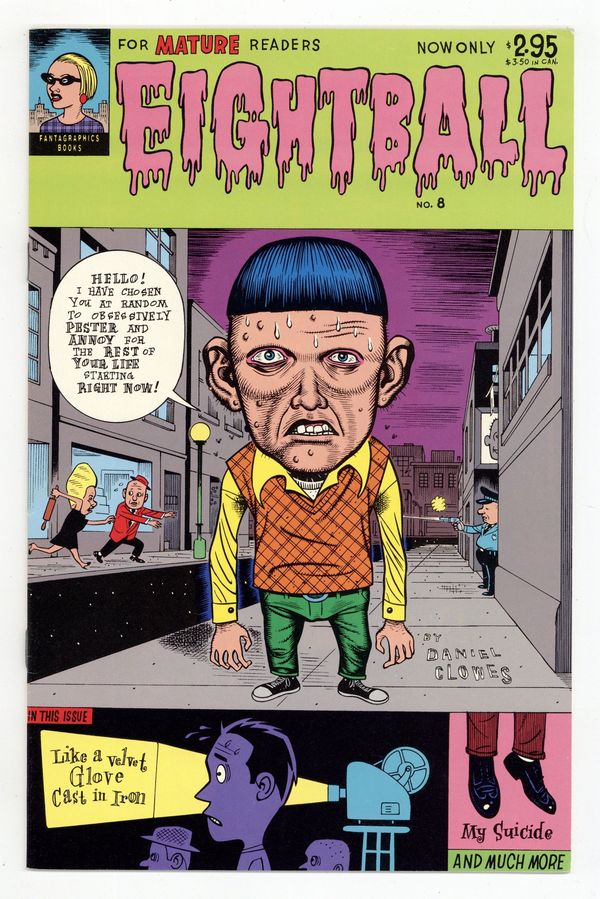 Cover art by Daniel Clowes. Part Eight--Like A Velvet Glove Cast In Iron; Clay views another strange film. Ugly Girls; Observations about beautiful and plain women. Komic Kollector's Korner; Dan Pussey explains comics economics. Nature Boy; A wander through a strange wood. My Suicide...; story about self-pity and suicide. Scripts and art by Daniel Clowes. 32 pgs. $2.95. Cover price $2.95.