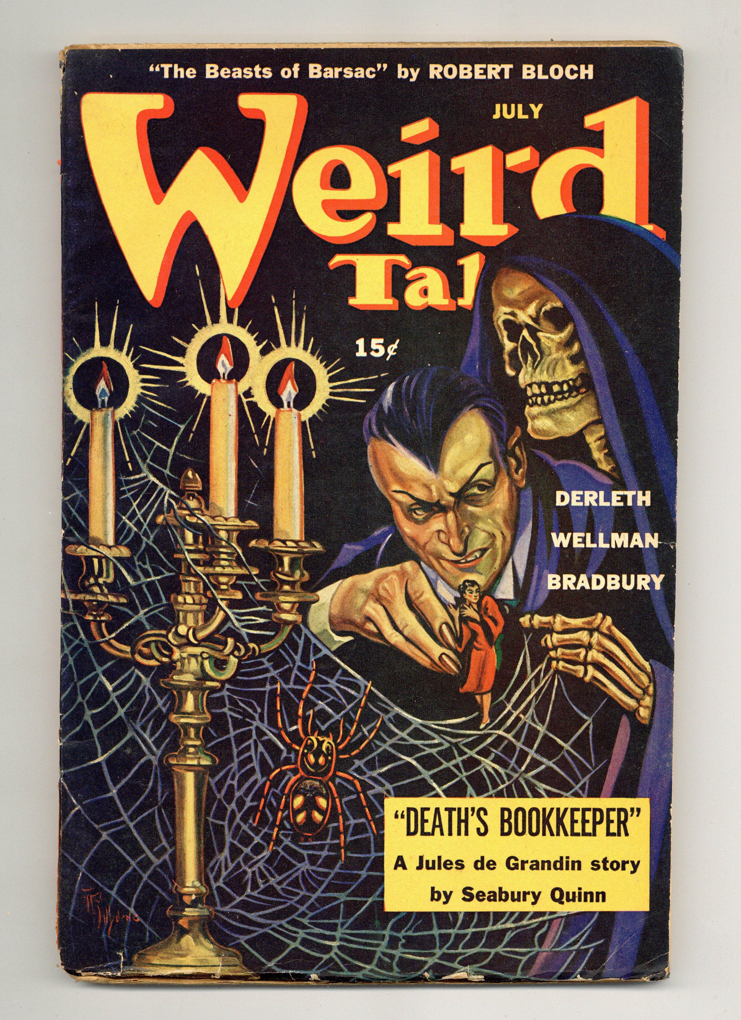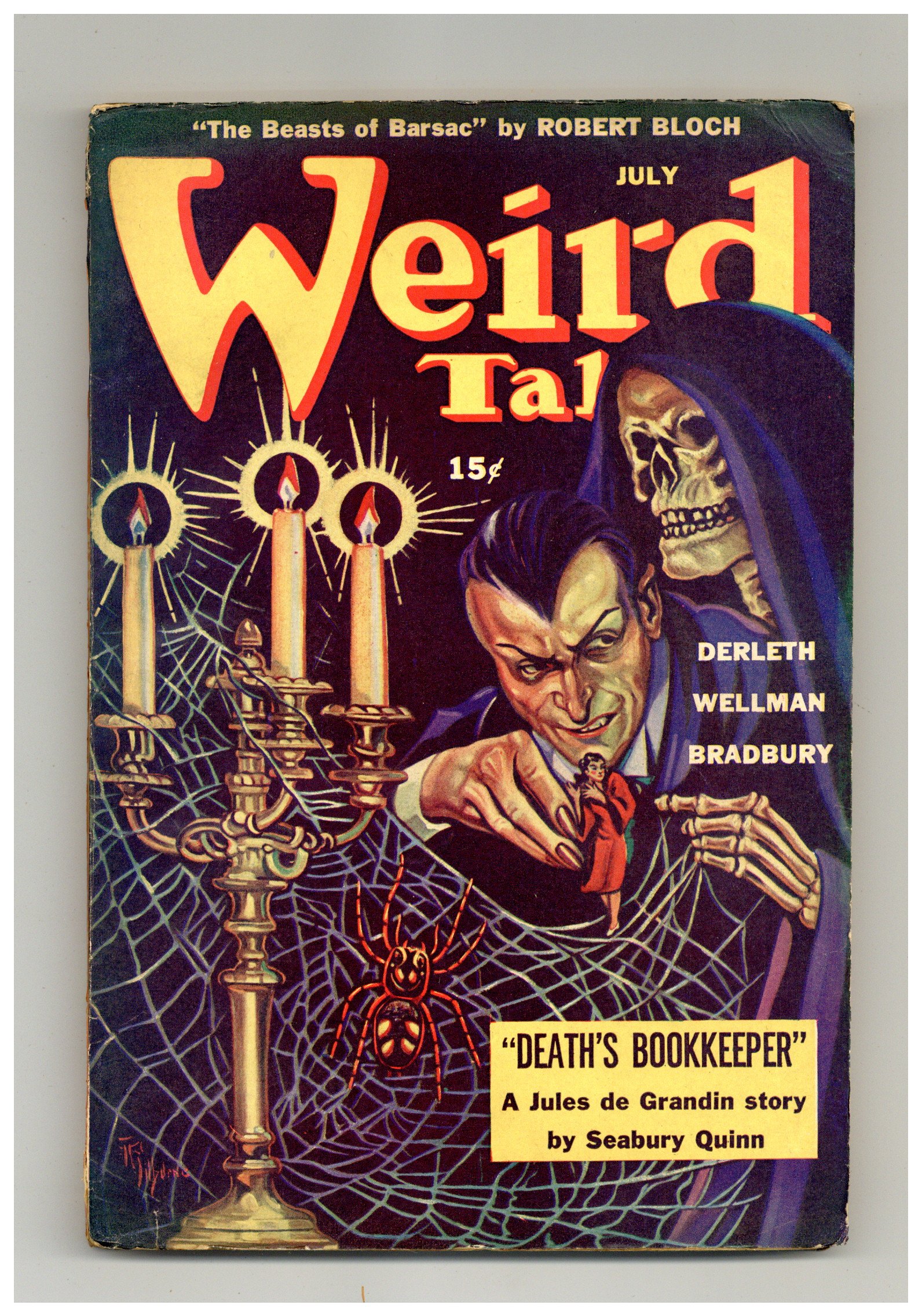 July 1944. Cover by A. R. Tilburne. "The Beasts of Barsac" by Robert Bloch, "There Was an Old Woman" by Ray Bradbury, and "Lady MacBeth of Pimley Square" by August Derleth, plus other horror and supernatural tales by Seabury Quinn, Manly Wade Wellman, P. Schuyler Miller, George N. Laws, Allison V. Harding, Crawford Sullivan, Stanton A. Coblentz. Illustrations by Hannes Bok, Virgil Finlay, Frank Utpatel, Elton Fax, A. R. Tilburne, Richard Bennett, Boris Dolgov, Andrew Brosnatch. 6 3/4-in. x 10-in., 96 newsprint pages, black and white (text with illustrations). Cover price $0.15.