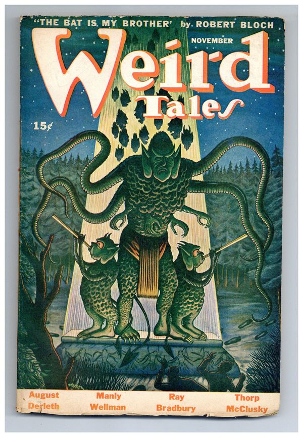 November 1944. Cover by Matt Fox. "The Dweller in Darkness" by August Derleth, "The Bat is My Brother" by Robert Bloch, and "The Jar" by Ray Bradbury, plus other horror and supernatural tales by Allison V. Harding, Stephen Grendon, Thorp McClusky, Manly Wade Wellman, and Hannes Bok. Illustrations by Hannes Bok, Boris Dolgov, Irwin J. Weill, Andrew Brosnatch, A. R. Tilburne. 6 3/4-in. x 10-in., 96 newsprint pages, black and white (text with illustrations). Cover price $0.15.
