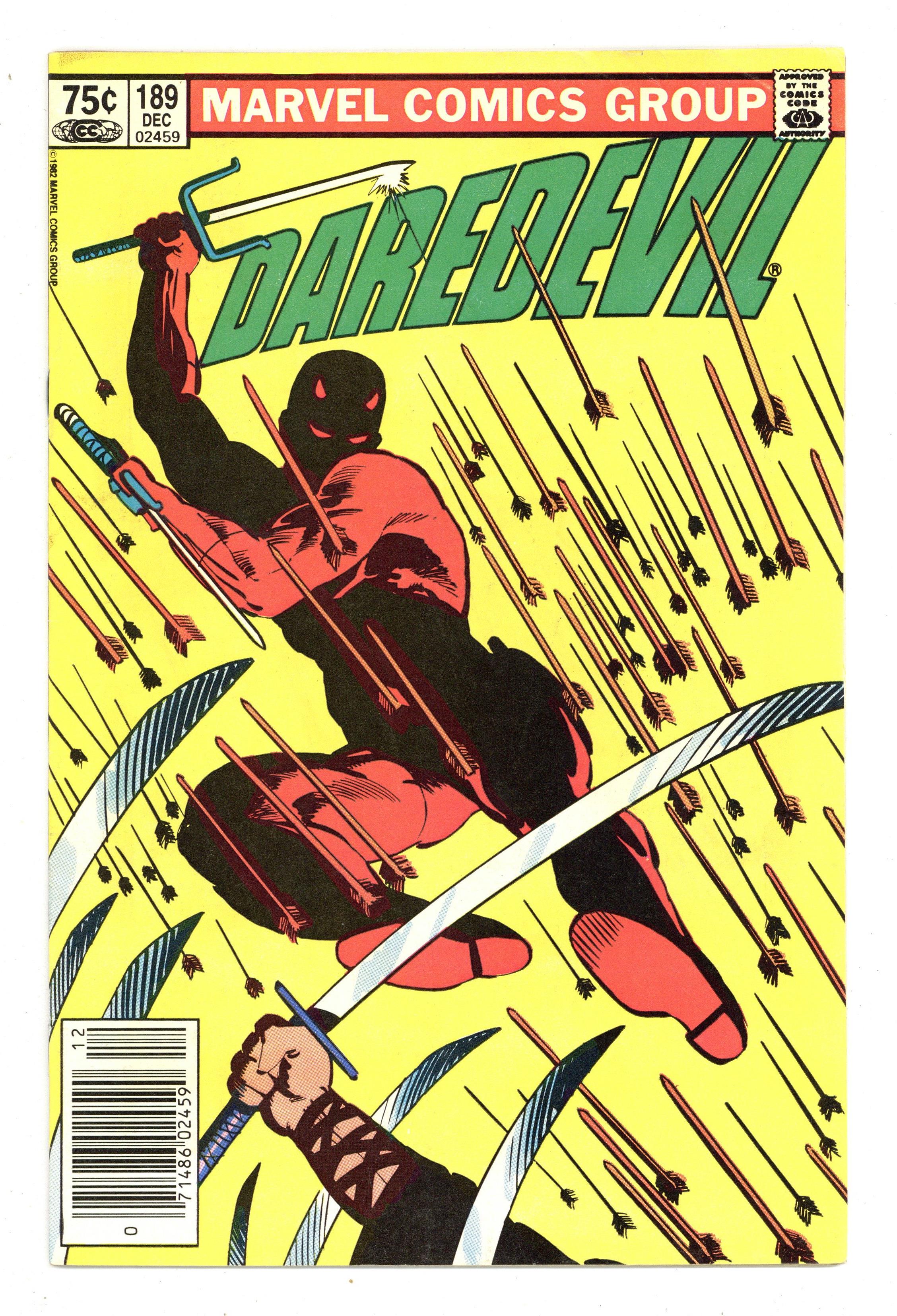 $5.00Canadian edition with $.75 cover price. Cover pencils by Frank Miller, inks by Klaus Janson. Siege, script by Frank Miller, pencils by Frank Miller (layouts) and Klaus Janson (finished art), inks by Klaus Janson; The Black Widow dies but is resurrected by Stone; DD and company have a free for all with the Hand in which Stick gives his life to save Matt; Widow and Foggy break up Heather and Matt; Stone tells DD that the Hand plans on resurrecting Elektra. Promo for next issue with Elektra replaces letters page, art by Miller. 36 pgs. Cover price $0.75.