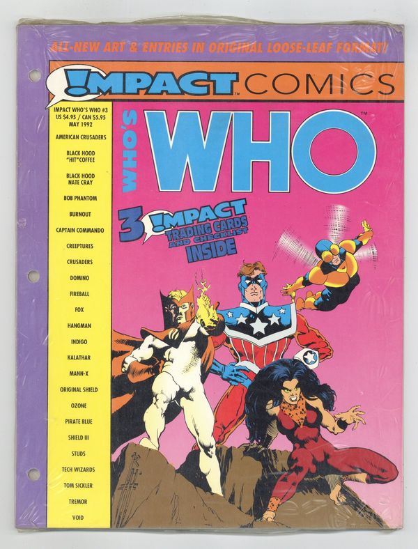 Volume 3 - "American Crusaders - Void!" - Crusaders Cover - Includes three trading cards and a checklist! Who's Who provides complete dossiers on your favorite Impact heroes, villains, supporting casts, places and vehicles. Featuring Character listings for: American Crusaders, Crusaders, Burnout, Domino, Fox, Ozone, Tremor, Void, and more! Softcover (loose-leaf pages Made for 3-ring binders), 8 1/2 x 11, 48 pages, full color. Cover price $4.95.