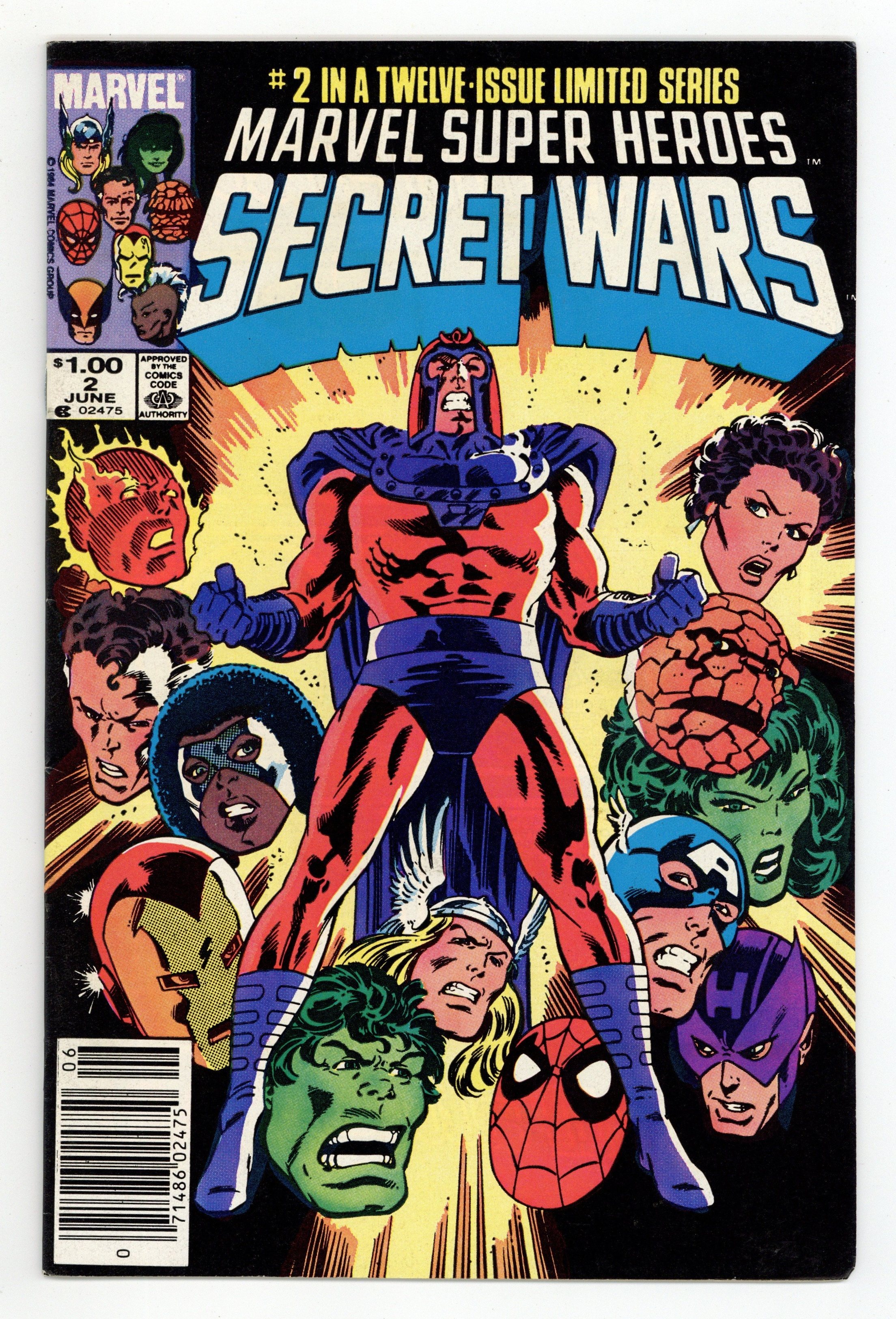Canadian Edition with $1.00 cover price. "Prisoners of War!" Part 2 of 12. Story by Jim Shooter. Art by Mike Zeck and John Beatty. On the far side of the universe on a planet simply known as Battleworld, the Avengers (Captain America, Thor, Wasp, Iron Man (James Rhodes), She Hulk, and Captain Marvel), the Fantastic Four (minus the Invisible Woman), X-Men (Professor X, Wolverine, Cyclops, Storm, Nightcrawler, Rogue, and Colossus), Magneto, Spider-Man, and the Incredible Hulk are locked in mortal combat with Doctor Doom, Ultron, Absorbing Man, the Lizard, Molecule Man, Doctor Octopus, Kang the Conqueror, the Wrecking Crew, and the Enchantress. The villains strike first in an unrelenting blitzkrieg. Will the heroes even survive the first titanic battle of this epic struggle? Plus, how do wildcards Magneto and the space god Galactus fit into this game? Cover price $1.00.