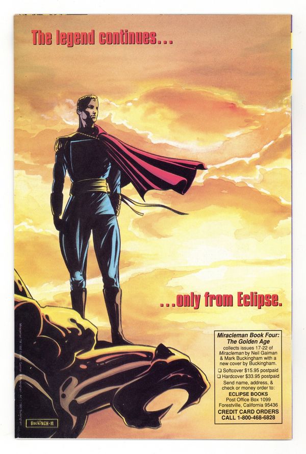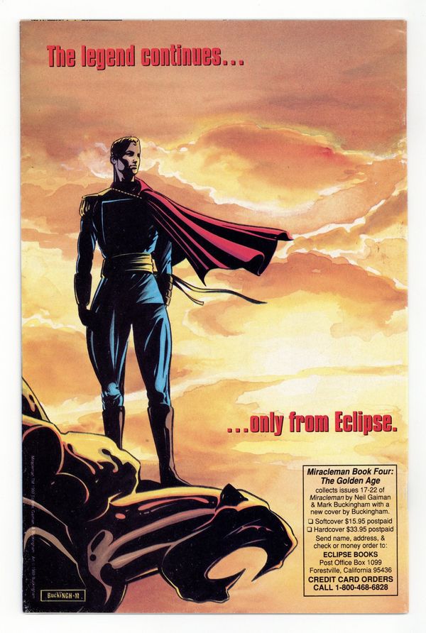 $36.00The Secret Origin of Young Miracleman - Written by Neil Gaiman. Art by Mark Buckingham. Cover by Barry Windsor-Smith. The Silver Age begins with Book One! Characters in this issue: The Zapster (introduction), Jenda (introduction), Duncan (introduction), Mist, Panorama (introduction), Kay (introduction), Young Miracleman, Mors, Winter Moran, Miraclewoman, British Bulldog (Big Ben), Firedrake (Huey Moon) and Warpsmiths (Kana Blur, Phon Mooda). Plus: 4 pages of Mark Buckingham's sketches of the Miracleman Family. 32 pages, full color. Cover price $2.50.