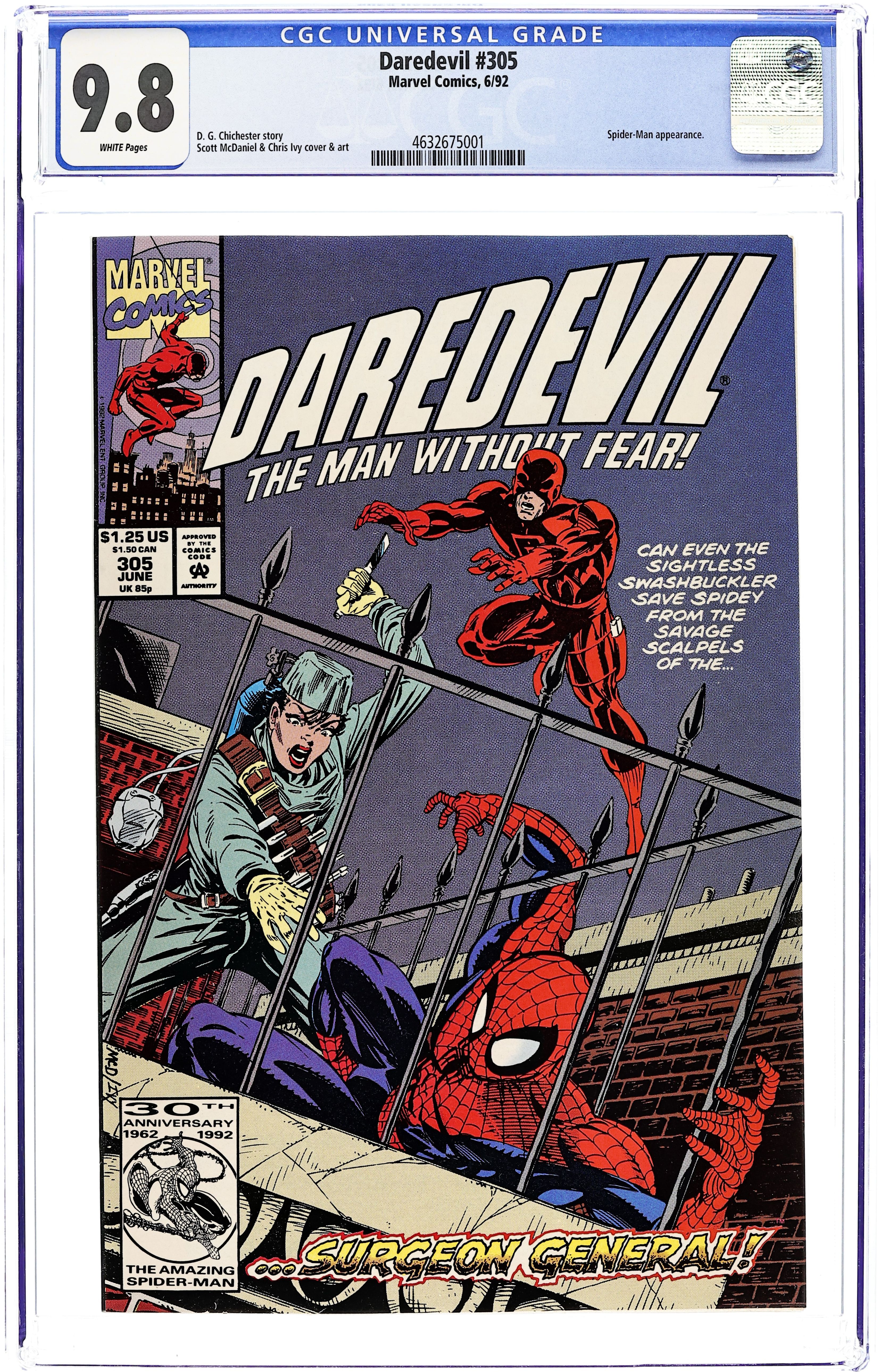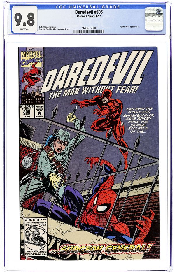 Cover pencils by Scott McDaniel, inks by Chris Ivy. Under The Knife starring Daredevil, Spider-Man [Peter Parker], Karen Page, and the Surgeon Genera, script by D. G. Chichester, pencils by Scott McDaniel, inks by Chris Ivy; Daredevil convinces Spidey to go undercover to flush out a surgeon who is cutting up her dates for their organs. 36 pgs. $1.25. Cover price $1.25.