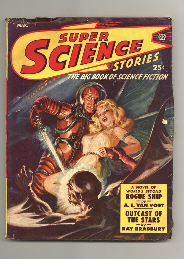 Cover by Norman Saunders. Science Fiction stories include the novel; "Rogue Ship" by A. E. Van Vogt, two novelettes; "A Step Farther Out" by Raymond Z. Gallun, and "World Without Darkness" by Neil R. Jones, and four short stories; "Outcast of the Stars" by Ray Bradbury, "The Ultimate One" by John D. MacDonald, "The Wheel of Time" by Robert Arthur, and "Exile of the Eons" by Arthur C. Clarke. Illustrations by Virgil Finaly, Paul Callé, and Hannes Bok. 7-in. x 9 1/2-in.; black and white text with spot illos.; 130 newsprint pages. Cover price $0.25.