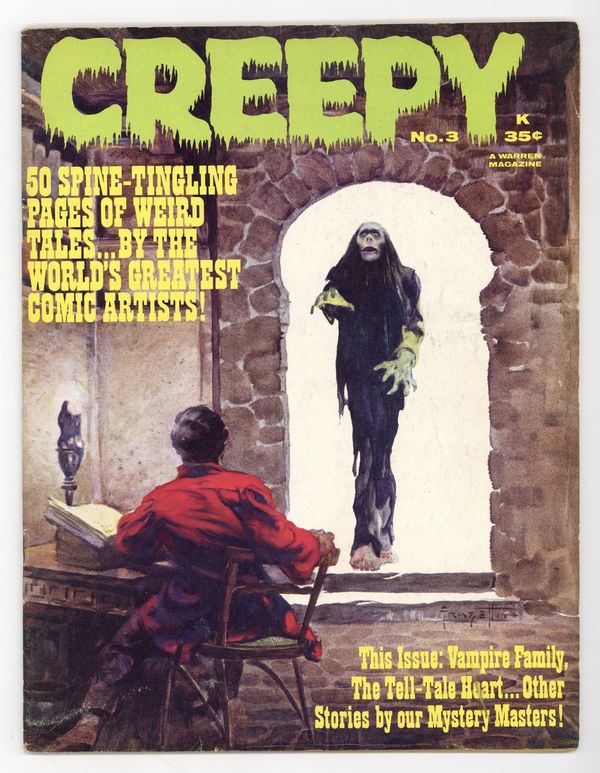 Issue #3. June 1965. Stories in this issue include: Swamped! by Archie Goodwin and Angelo Torres; Tell-Tale Heart by Archie Goodwin and Reed Crandall (from the story by Edgar Allan Poe); Howling Success! by Archie Goodwin and Angelo Torres; Haunted! by Archie Goodwin and Gray Morrow; Incident in the Beyond by Archie Goodwin and Gray Morrow; and Return Trip by Arthur Porges and Joe Orlando. Cover by Frank Frazetta. 8.25" x 10.75". 48 pages. Black and white. Cover price $0.35.