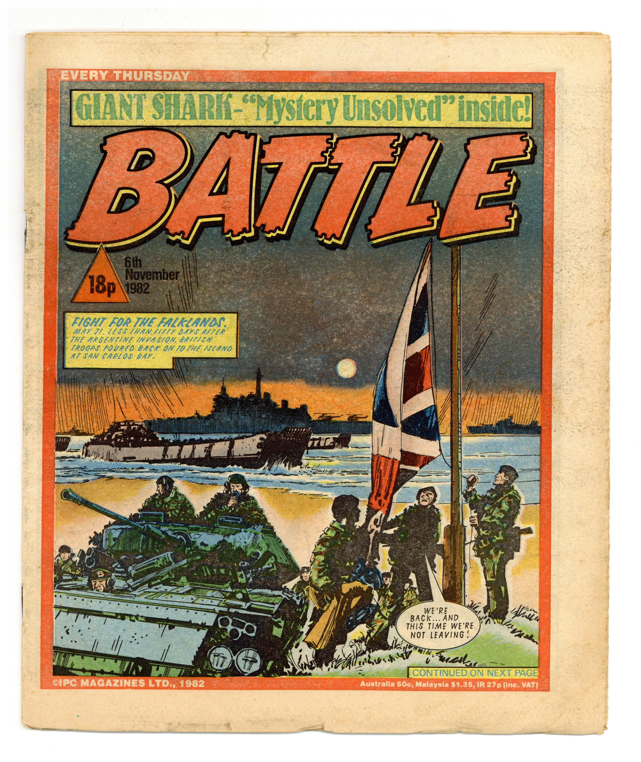 November 6, 1982. Published by IPC Magazines, Ltd. in the U.K. "Tough action war stories every week!" Combined with Valiant (also an IPC publication). 9 x 11 in.; black and white (color centerspread); 32 pages; 18p cover price.