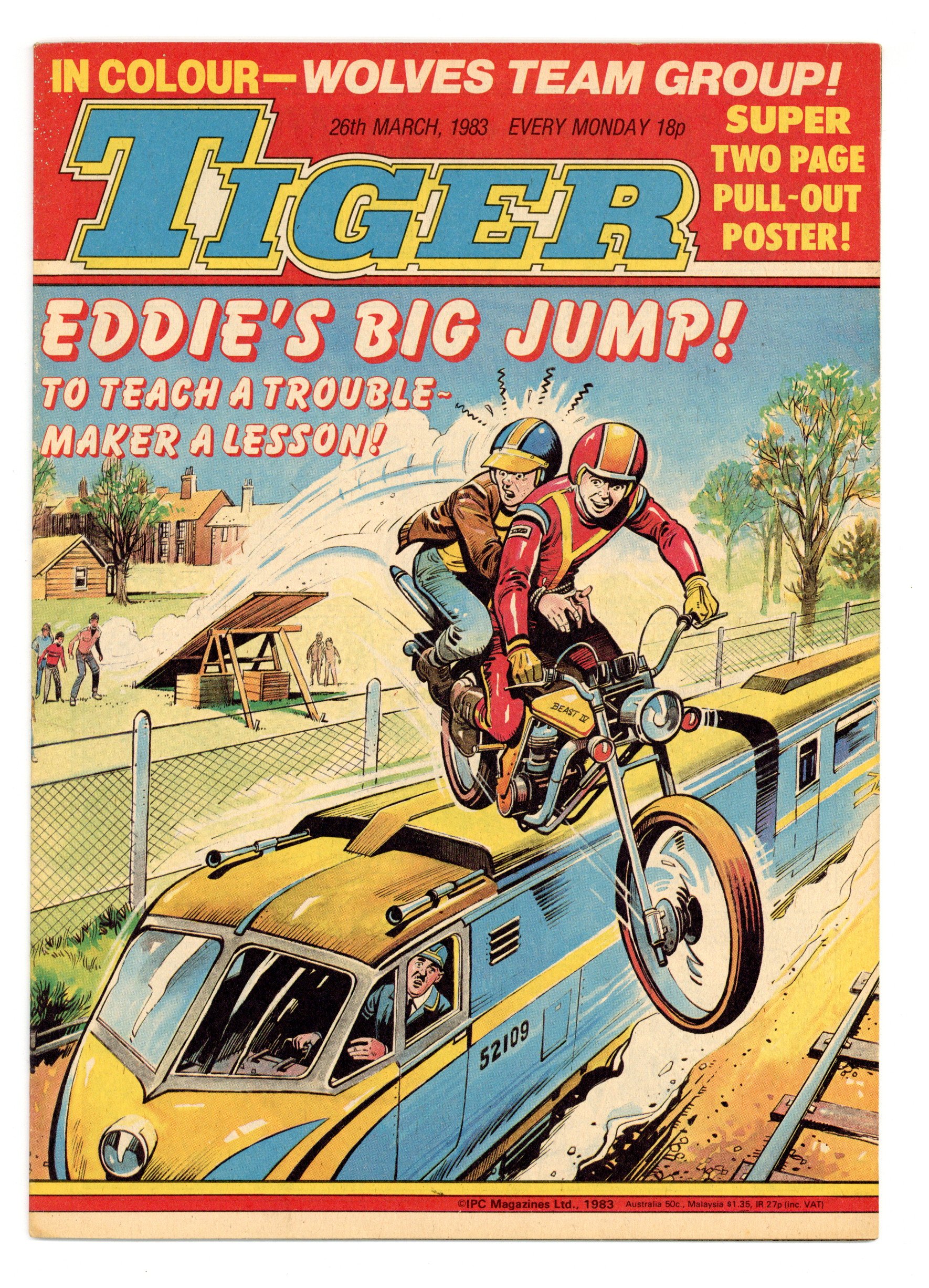$2.50Tiger - March 26, 1983 - Published by Fleetway Publications, Ltd. in the U.K. Action/adventure/sports stories featuring Nelson Lord, T.I.G.E.R. Agent, Typhoon Tracy, the Mighty Smiths, Roy of the Rovers, Skid Solo, Casey's Crew, the Black Archer, Robot Builders, the Fiery Furnaces, Olac the Gladiator, Jet-Ace Logan, and more. Newsprint, 9-in. x 11-in in., 40 pages, B&W.