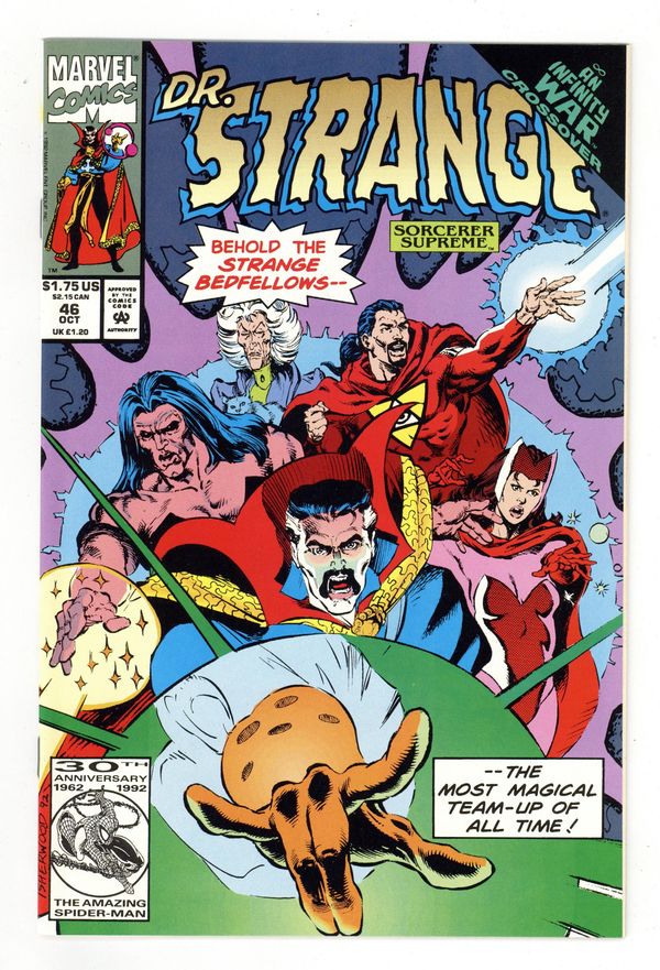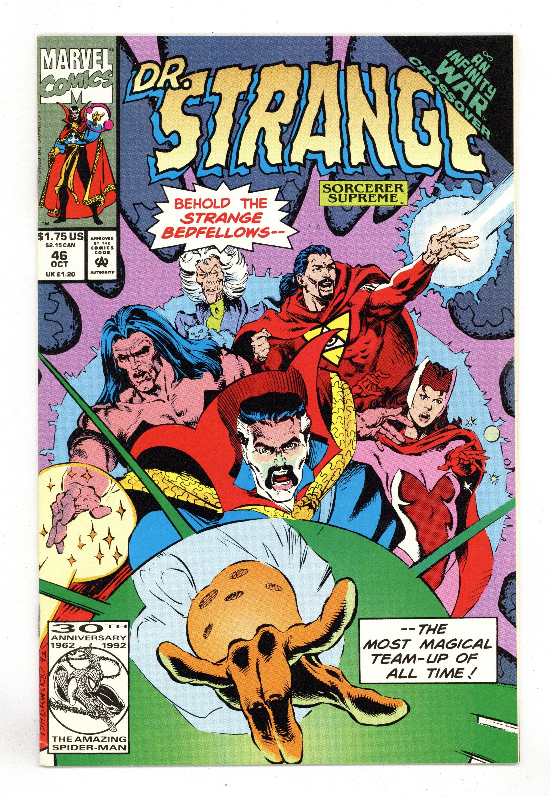 Tags: Infinity War (1992) (part 5.2), Marvel Legacy Numbering: Doctor Strange (part 310), Doctor Strange$5.00Cover art by Geof Isherwood. Strange Bedfellows, script by Roy Thomas, Jean-Marc Lofficier [as R.J.M. Lofficier], and Randy Lofficier [as R.J.M. Lofficier], art by Geof Isherwood; Doc and the other Mystic heavyweights try to free the Earth from it paralysis, only to encounter the Masked Dr. Strange. The Scarlet Witch, Dr. Druid, and the Sleepwalker guest star in this Infinity War crossover. Story continues from Infinity War 4. 36 pgs. $1.75. Cover price $1.75.