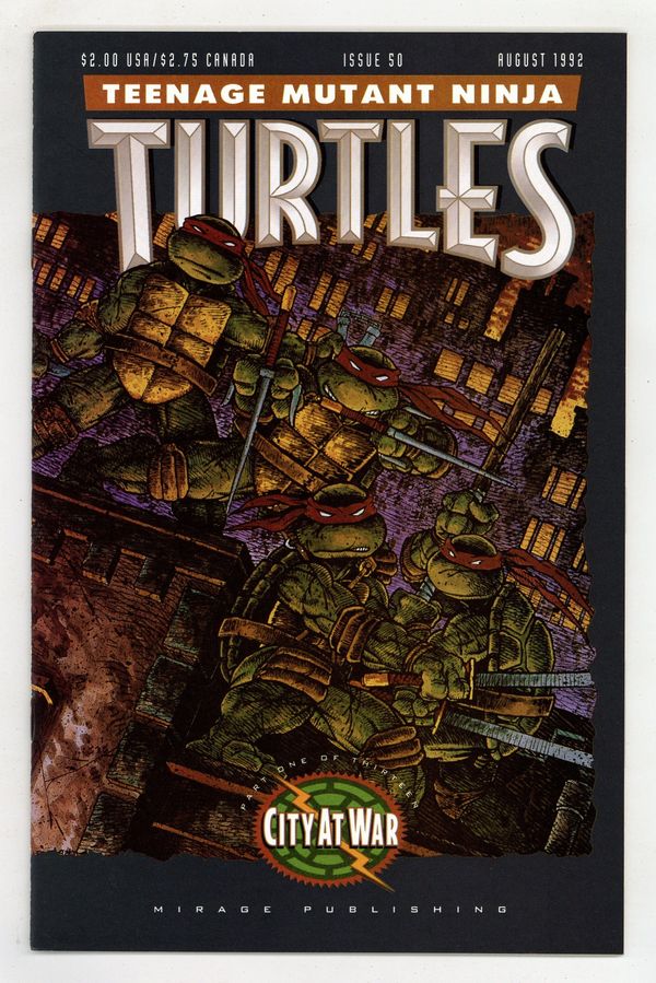 Published Aug 1992 by Mirage Studios.$29.00City At War, Part 1. After three years, creators Kevin Eastman and Peter Laird resume full creative duties on the title that made them famous with a multi-chapter epic. Story, art and cover by Kevin Eastman and Peter Laird. Todd McFarlane and Walt Simonson pin-ups. Black and white; 44 pages. Cover price $2.00. Cover price $2.00.