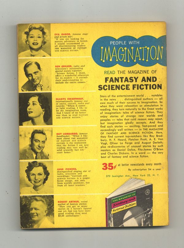 Cover by George Gibbons. Fantasy and science fiction stories by Charles L. Harness, Isaac Asimov, Kris Neville, Bruce A. Agnew, Con Pederson, Leslie Charteris, Ralph Robin, Philip K. Dick, Arthur Porges, James Blish, W. B. Ready, Morris Hershman, H. Nearing Jr, and Evelyn E. Smith. Softcover. 5.5-in. x 7.5-in. 132 pages, black and white (all text). Cover price $0.35.