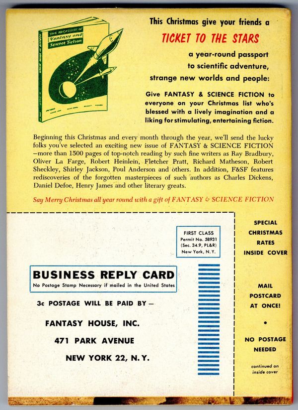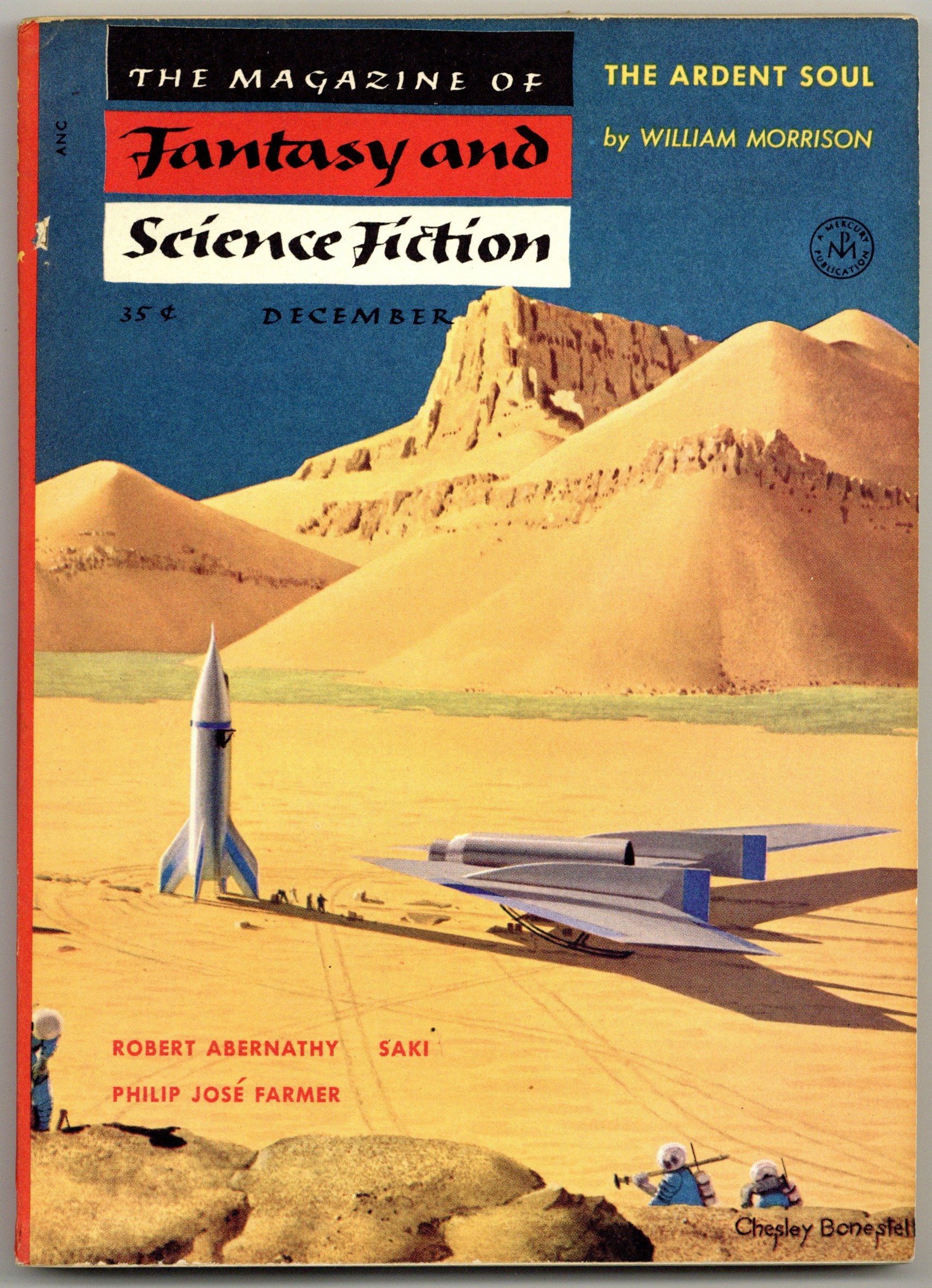 Tags: Anthology / CollectionPublished Dec 1954 by Mercury Publications.$6.00Cover by Chesley Bonestell. "Totem and Taboo" by Philip José Farmer and "The Father-Thing" by Philip K. Dick, plus more fantasy and science fiction stories by Robert Abernathy, Charles Webb, Saki, Edward Lee, Gordon R. Dickson, Francois Augustin Paradis De Moncrif, William Morrison, Robert Sherman Townes, Glen Henexson, and John Novotny. Softcover. 5.5-in. x 7.5-in. 132 pages, black and white (all text). Cover price $0.35.