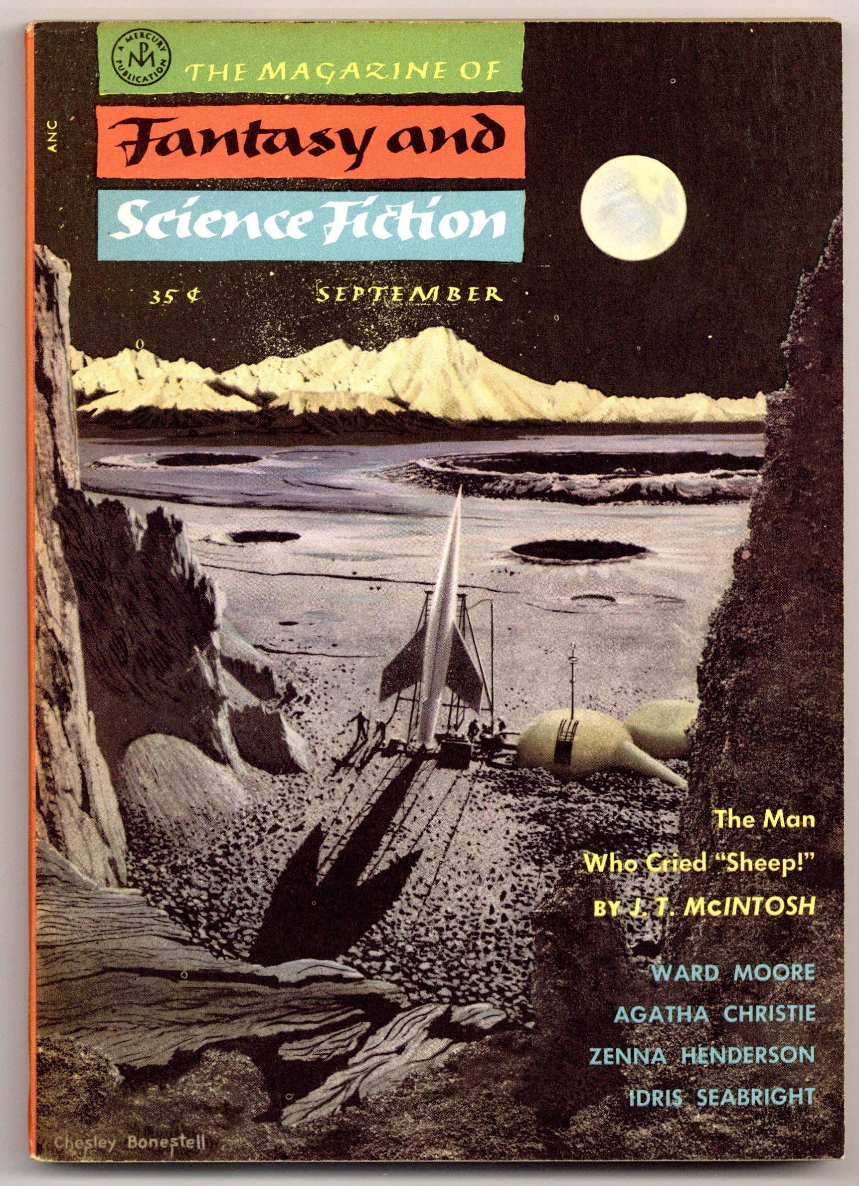 Tags: Anthology / CollectionPublished Sep 1955 by Mercury Publications.$7.20Cover by Chesley Bonestell. "Too Far" by Fredric Brown, plus more fantasy and science fiction stories by J. T. McIntosh, Agatha Christie, Margaret St. Clair (as Idris Seabright), Eric St. Clair, Ward Moore, Saki, Thyra Samter Winslow and Zenna Henderson. Softcover. 5.5-in. x 7.5-in. 132 pages, black and white (all text). Cover price $0.35.