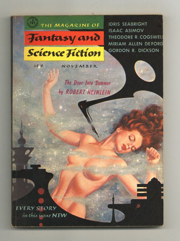 Tags: Anthology / CollectionPublished Nov 1956 by Mercury Publications.$10.75Cover by Kelly Freas. "The Door into Summer" 2/3 by Robert A. Heinlein, plus more fantasy and science fiction stories by Robert F. Young, Gordon R. Dickson, Margaret St. Clair (as Idris Seabright), Issac Asimov, Miriam Allen DeFord, and Theodore R. Cogswell. Softcover, 5 1/2-in. x 7 1/2-in., 128 pages, B&W. Cover price $0.35.
