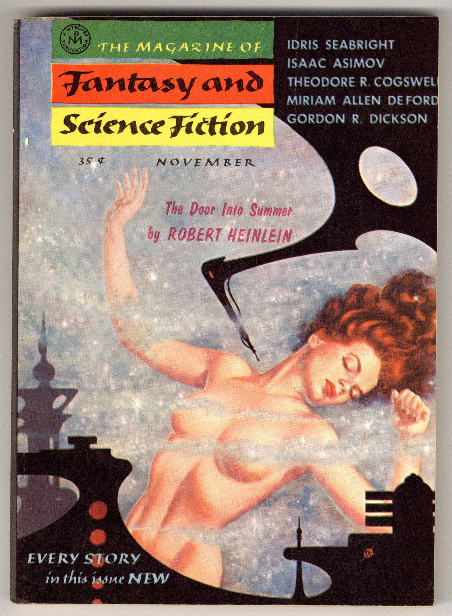 Tags: Anthology / CollectionPublished Nov 1956 by Mercury Publications.$13.00Cover by Kelly Freas. "The Door into Summer" 2/3 by Robert A. Heinlein, plus more fantasy and science fiction stories by Robert F. Young, Gordon R. Dickson, Margaret St. Clair (as Idris Seabright), Issac Asimov, Miriam Allen DeFord, and Theodore R. Cogswell. Softcover, 5 1/2-in. x 7 1/2-in., 128 pages, B&W. Cover price $0.35.