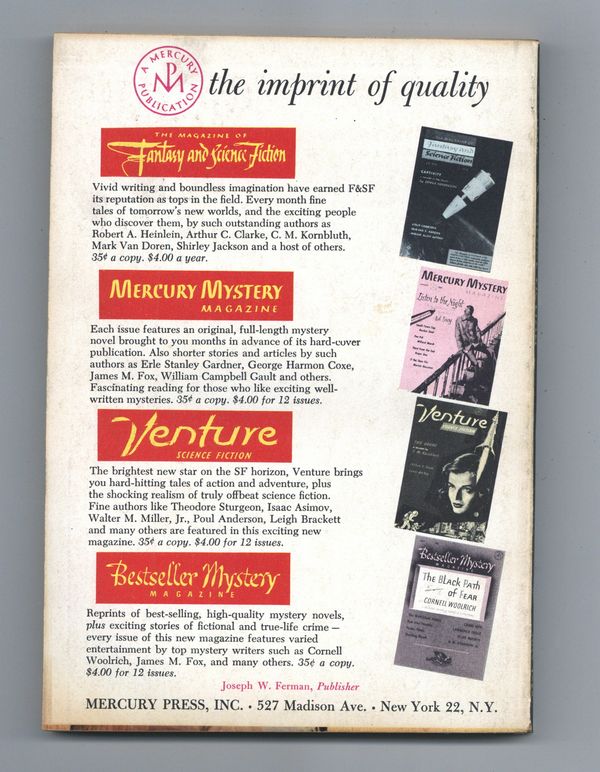 Tags: Anthology / CollectionPublished Jul 1958 by Mercury Publications.$18.00Cover by Barry Waldman. Science fiction and fantasy stories by Gordon R. Dickson, Kit Reed, Jules Verne, Mildred Clingerman, Ron Goulart, Issac Asimov, Roy Vickers, Stephen Barr, Michael Fessier and C. M. Kornbluth. Softcover, 5.5-in., x 7.5-in., 130 pages, black and white (all text) Cover price $0.35.