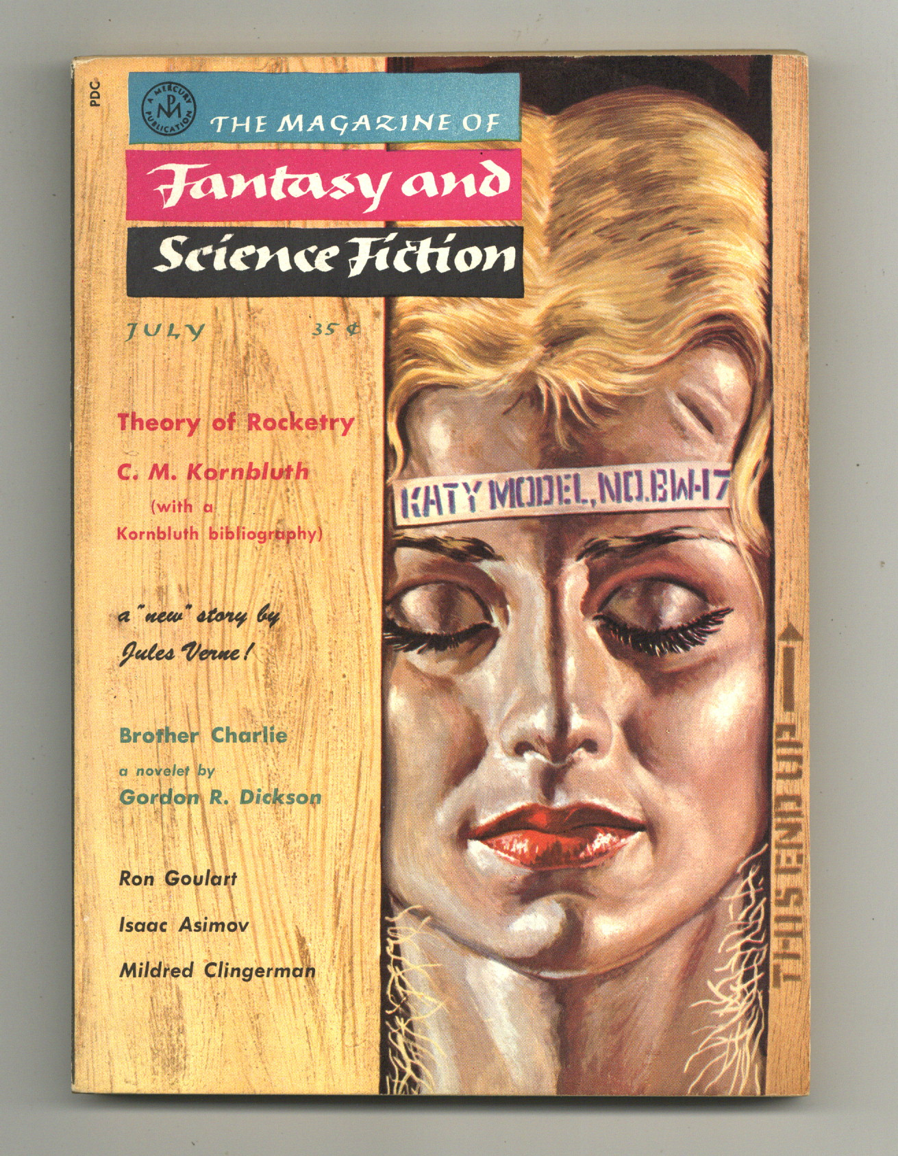 Tags: Anthology / CollectionPublished Jul 1958 by Mercury Publications.$24.00Cover by Barry Waldman. Science fiction and fantasy stories by Gordon R. Dickson, Kit Reed, Jules Verne, Mildred Clingerman, Ron Goulart, Issac Asimov, Roy Vickers, Stephen Barr, Michael Fessier and C. M. Kornbluth. Softcover, 5.5-in., x 7.5-in., 130 pages, black and white (all text) Cover price $0.35.
