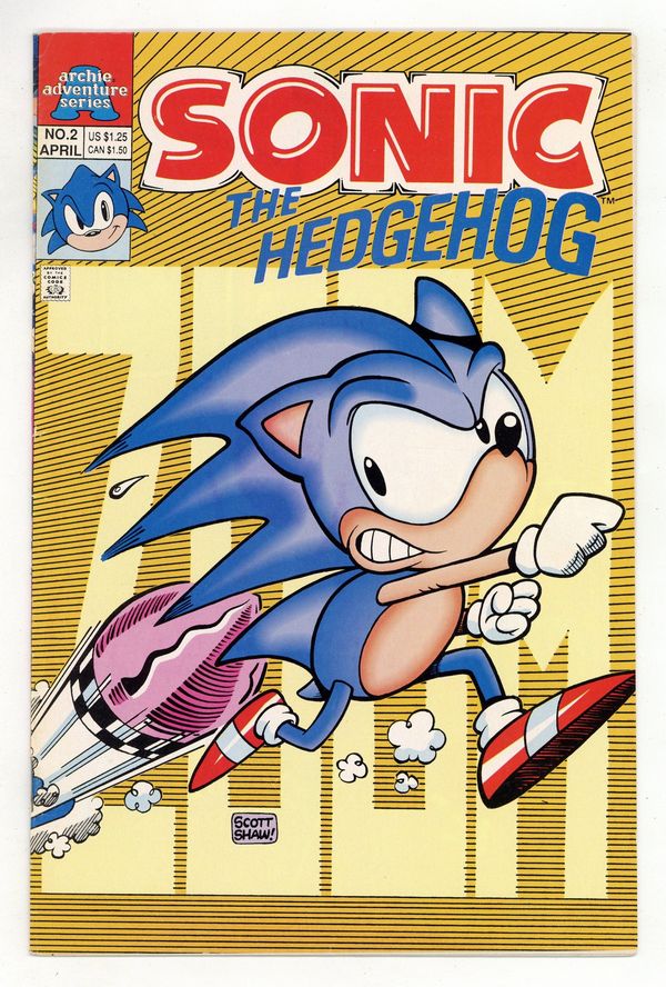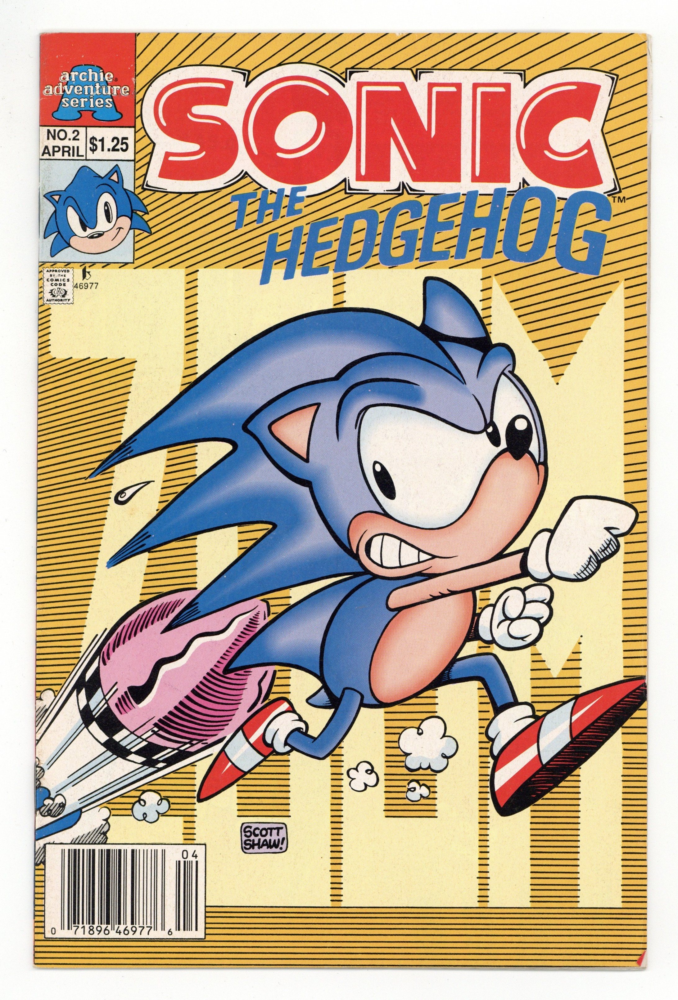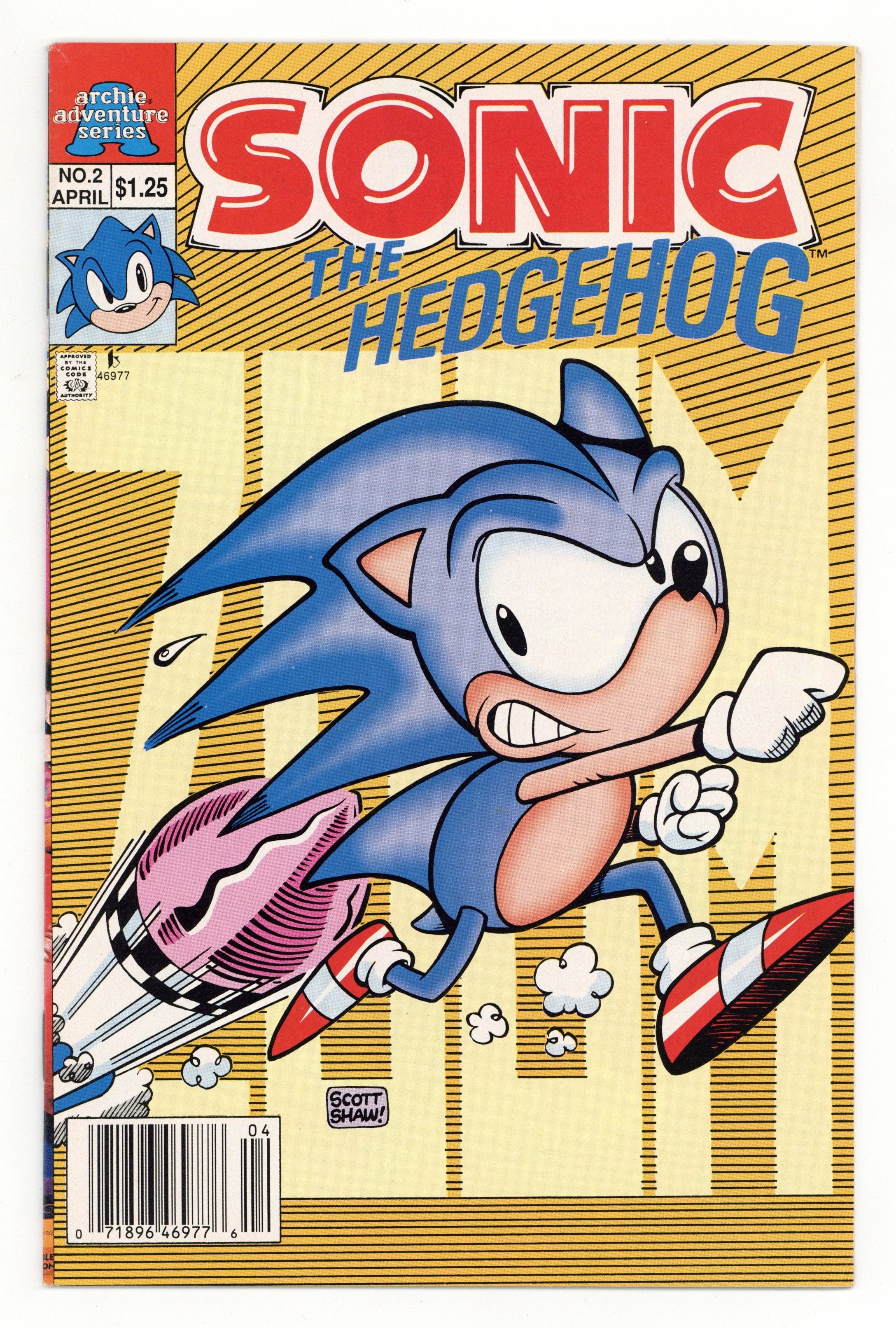 Published Apr 1993 by Archie Publications.$16.50Direct Edition. Based on the Sega video game. Cover by Scott Shaw. "A Crowning Achievement," script by Michael Gallagher, pencils by Scott Shaw, inks by Bill White; Sally discovers the Magic Crown of the Acorn Kings has been stolen by a robot spy of Dr. Robotnik; Sonic, Antoine and Tails travel the four corners of the planet Mobius to retrieve the mystic emeralds of the crown. 36 pgs., full color. $1.25. Cover price $1.25.