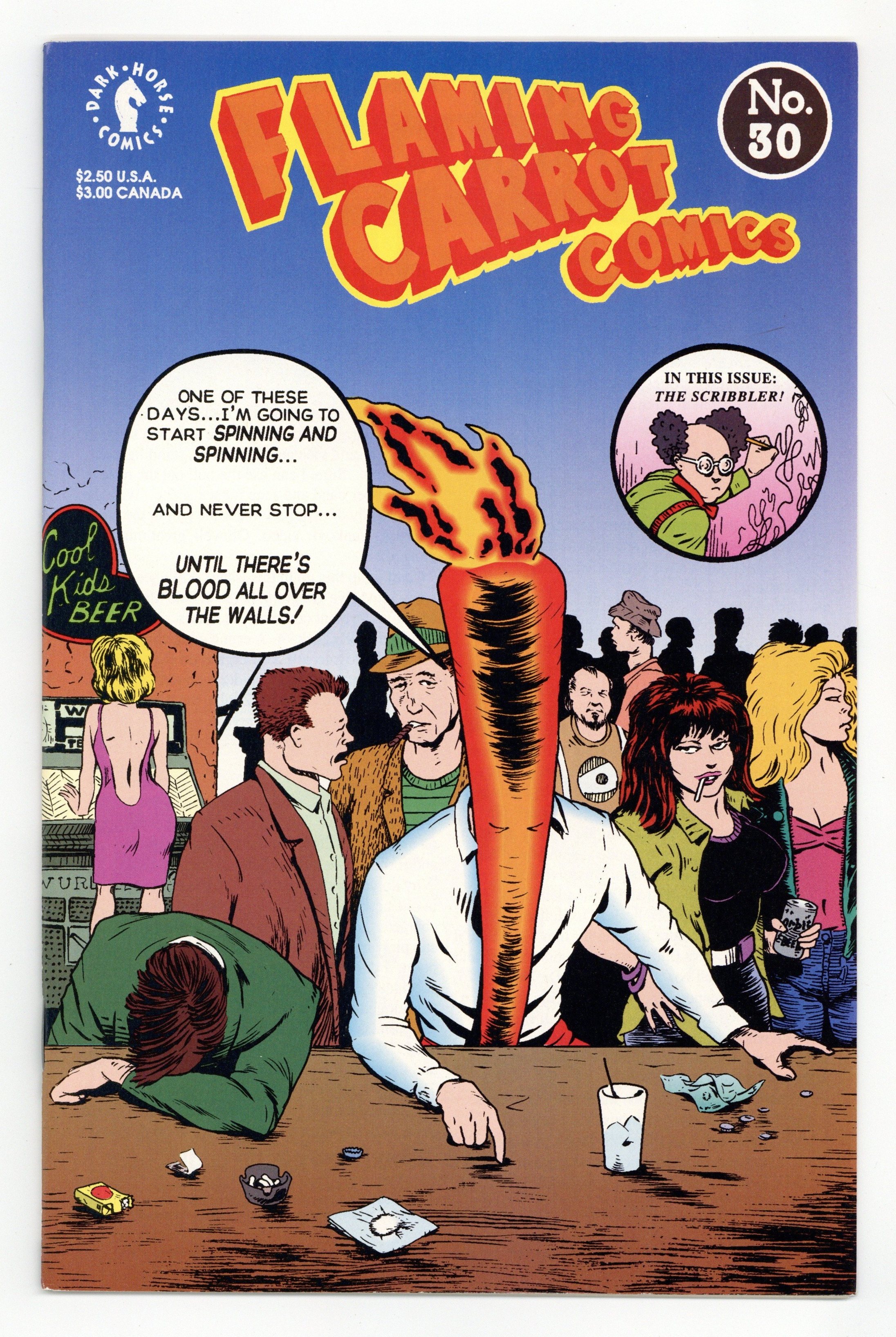 Published Dec 1992 by AV/Dark Horse.$15.00Story and art by Bob Burden. The Flaming Carrot and the Man in the Moon continue to mix it up! Will they end their senseless battle and become friends in time to prevent Aunt Clau and her Crime Kids from stealing human body parts to sell on the black market? Only this issue and the beyond-genius mind of creator Bob Burden can supply you with the answer! 32 pages, B&W. Cover price $2.50.