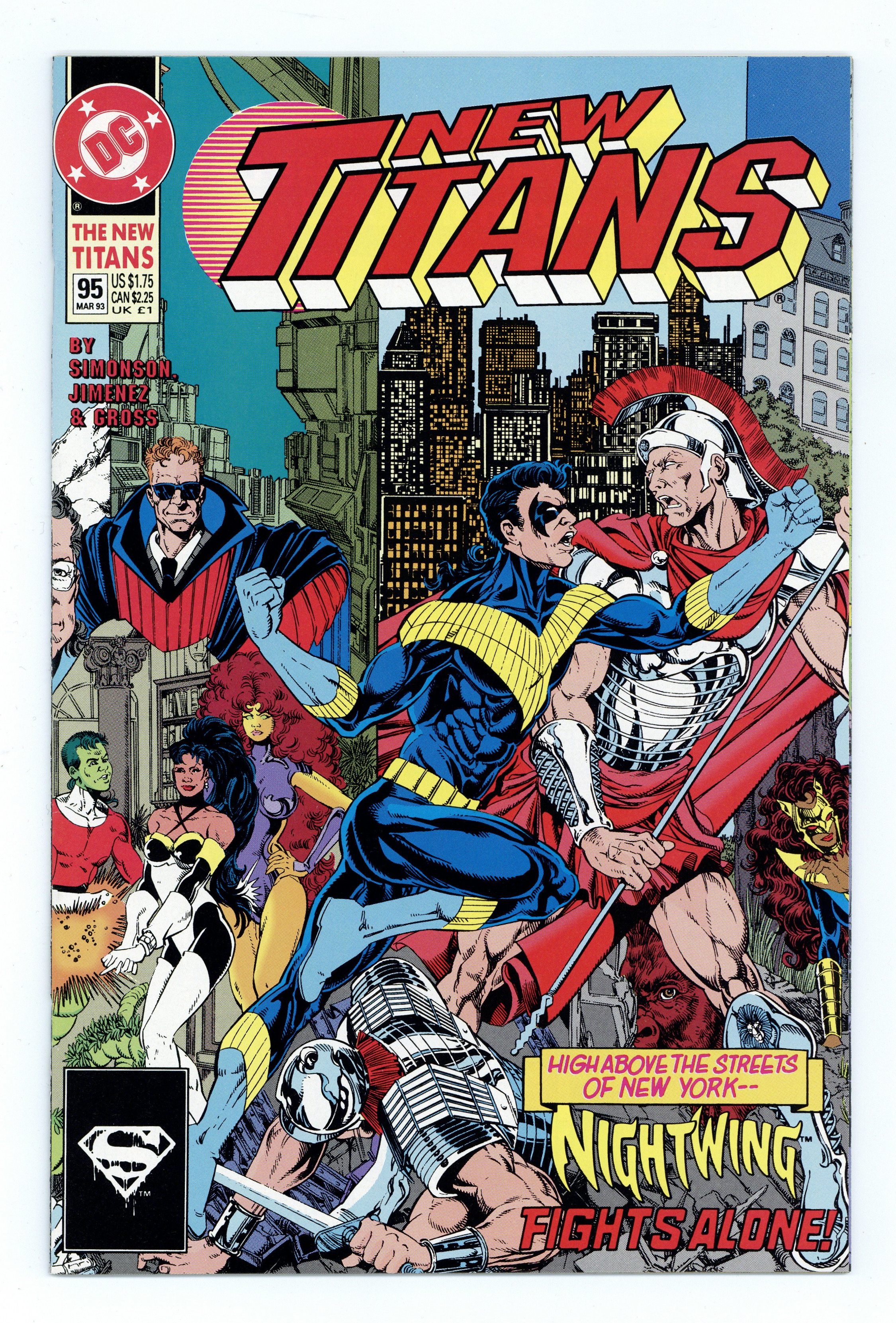 "...into the Fire!" Part 2 of 3. Guest-starring the Team Titans. Written by Louise Simonson. Art by Phil Jimenez and Peter Gross. In Russia Red Star continues his search for Cyborg. Meanwhile back in New York, Nightwing is attacked by techno-terrorists. NOTE: New Teen Titans (1984- 2nd Series) #94-96 have interlocking covers Cover price $1.75.