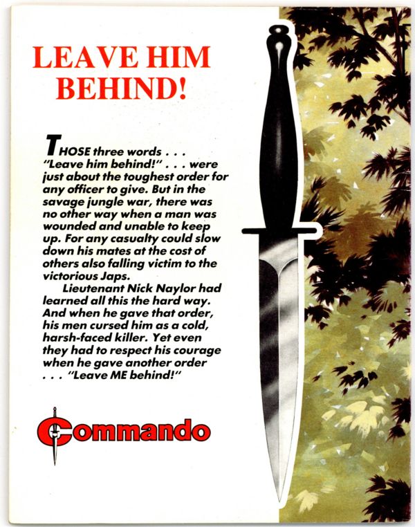 Published Oct 1993 by D. C. Thomson & Co..$5.20Weekly British War comics digest. "Leave him Behind!" Softcover, 5 1/2-in. x 6 1/2-in., 68 pages, B/W.
