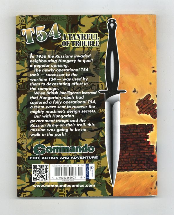 Published May 2012 by D. C. Thomson & Co..$8.49T54: A Tankful of Trouble - Written by Alan Hebden. Art by Morahin. Cover by Janek Matysiak. In 1956, the Russians invaded neighbouring Hungary to quell a popular uprising. The newly-operational T54 tank -- successor to the wartime T34 -- was used by them to devastating effect in the campaign. When British Intelligence learned that Hungarian rebels had captured a fully operational T54, a team was sent to recover the mighty machine's design secrets. But with Hungarian government troops and the Russian Army on their trail, this mission was going to be no walk in the park! Weekly British War comics digest. Softcover, 5 1/2-in. x 6 1/2-in., 68 pages, B&W.