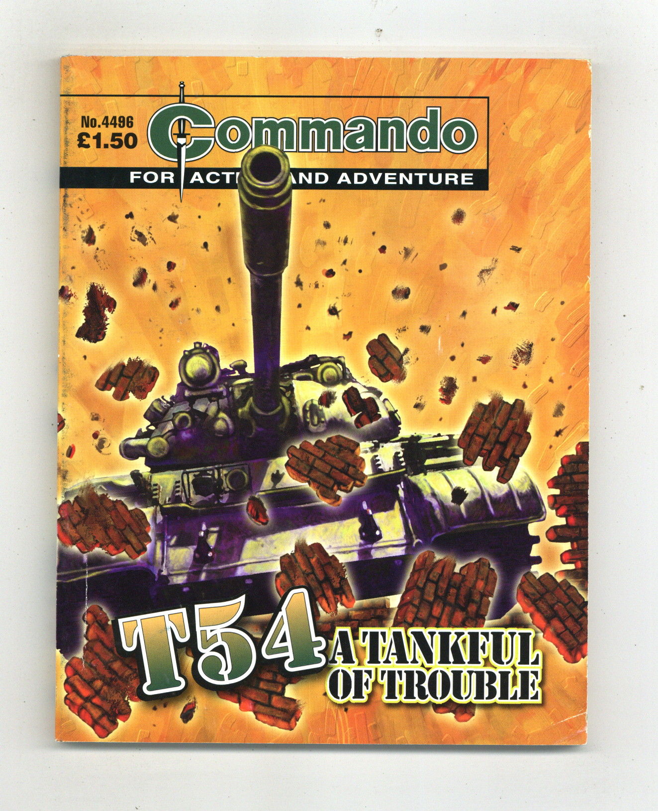 T54: A Tankful of Trouble - Written by Alan Hebden. Art by Morahin. Cover by Janek Matysiak. In 1956, the Russians invaded neighbouring Hungary to quell a popular uprising. The newly-operational T54 tank -- successor to the wartime T34 -- was used by them to devastating effect in the campaign. When British Intelligence learned that Hungarian rebels had captured a fully operational T54, a team was sent to recover the mighty machine's design secrets. But with Hungarian government troops and the Russian Army on their trail, this mission was going to be no walk in the park! Weekly British War comics digest. Softcover, 5 1/2-in. x 6 1/2-in., 68 pages, B&W.