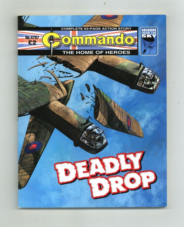 Deadly Drop - Written by George Low. Art by Olivera. Cover by Janek Matysiak. After a "friendly fire" incident cost the lives of his comrades, Private Ron Allan clashed violently with a fellow paratrooper, Corporal Alec Brown, the man he held responsible. Tensions were still high between them when, en route to a drop zone, history repeated itself. Alec's Horsa glider smashed into Ron's, sending both spiraling downwards. Alec's life was now in as much danger from his supposed colleague as it was from the Germans -- provided they both survived the drop to the hungry sea below. Weekly British War comics digest. Softcover, 5 1/2-in. x 6 1/2-in., 68 pages, B&W.