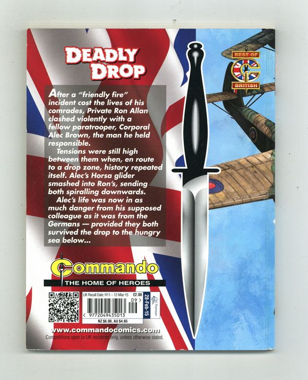 Published Feb 2015 by D. C. Thomson & Co..$4.20Deadly Drop - Written by George Low. Art by Olivera. Cover by Janek Matysiak. After a "friendly fire" incident cost the lives of his comrades, Private Ron Allan clashed violently with a fellow paratrooper, Corporal Alec Brown, the man he held responsible. Tensions were still high between them when, en route to a drop zone, history repeated itself. Alec's Horsa glider smashed into Ron's, sending both spiraling downwards. Alec's life was now in as much danger from his supposed colleague as it was from the Germans -- provided they both survived the drop to the hungry sea below. Weekly British War comics digest. Softcover, 5 1/2-in. x 6 1/2-in., 68 pages, B&W.