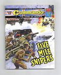 Five Mile Snipers - Written by George Low. Art and Cover by Carlos Pino. It was the ultimate insult, being called "Five Mile Snipers" -- with a sneering tone, this phrase accused artillery gunners of being tucked safely out of harm's way, a large distance from the front line. After a run-in with an American Army Ranger officer, Sergeant Stan Wilkins, who was in charge of a battery of 25-pounder guns, certainly resented the implication that he and his new crew were cowards. Stan was determined to disprove this and embarked on a deadly mission to hunt down a group of ruthless German paratroopers. Weekly British War comics digest. Softcover, 5 1/2-in. x 6 1/2-in., 68 pages, B&W.