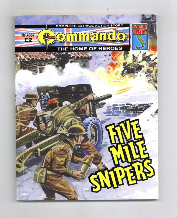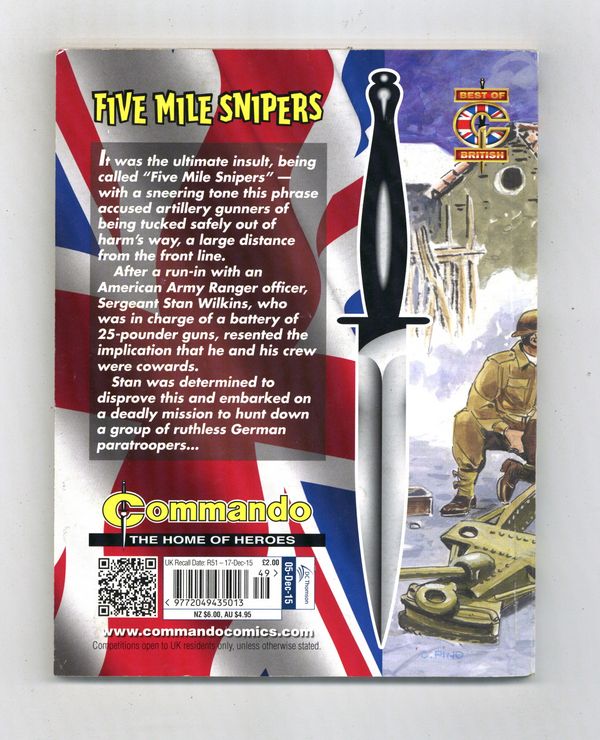 Published Dec 2015 by D. C. Thomson & Co..$4.80Five Mile Snipers - Written by George Low. Art and Cover by Carlos Pino. It was the ultimate insult, being called "Five Mile Snipers" -- with a sneering tone, this phrase accused artillery gunners of being tucked safely out of harm's way, a large distance from the front line. After a run-in with an American Army Ranger officer, Sergeant Stan Wilkins, who was in charge of a battery of 25-pounder guns, certainly resented the implication that he and his new crew were cowards. Stan was determined to disprove this and embarked on a deadly mission to hunt down a group of ruthless German paratroopers. Weekly British War comics digest. Softcover, 5 1/2-in. x 6 1/2-in., 68 pages, B&W.
