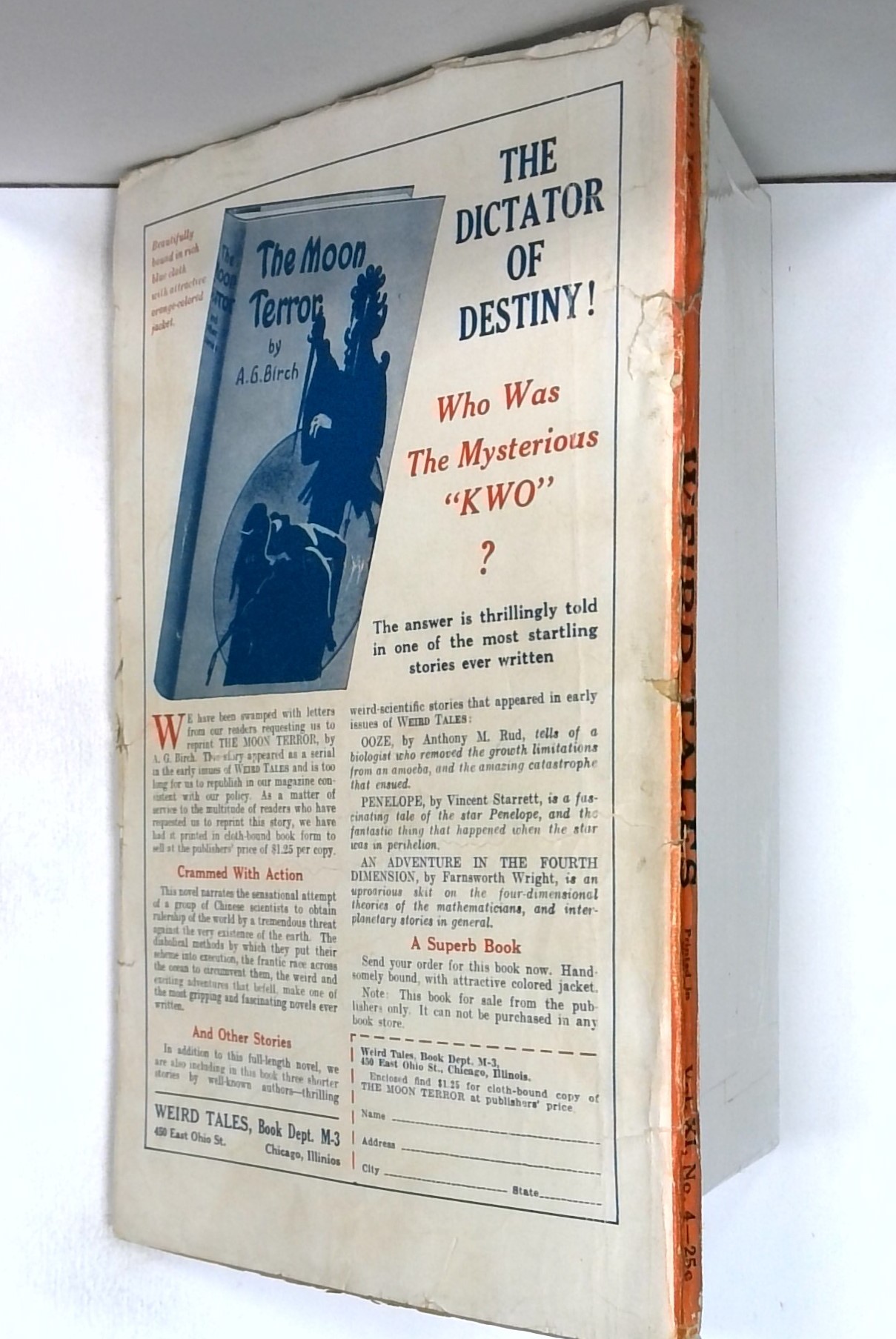 Volume 11, Issue 4 - April 1928. Edited by Farnsworth Wright. Horror and Fantasy stories in the pulp style. 6.75-in. x 10-in.; 128 newsprint pages, text (with B&W illustrations). Cover price $0.25.