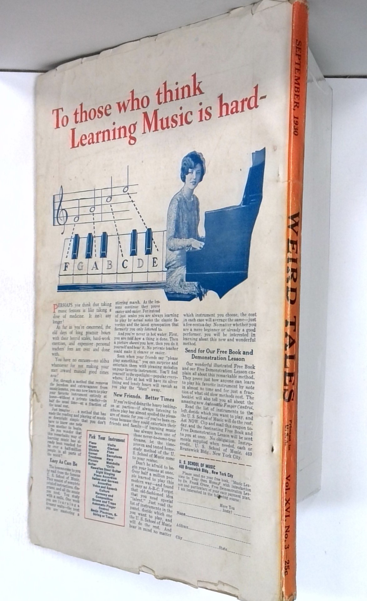 Volume 16, Issue 3 - September, 1930. Edited by Farnsworth Wright. Horror and Fantasy stories in the pulp style. 6.75-in. x 10-in.; 128 newsprint pages, text (with B&W illustrations). Cover price $0.25.