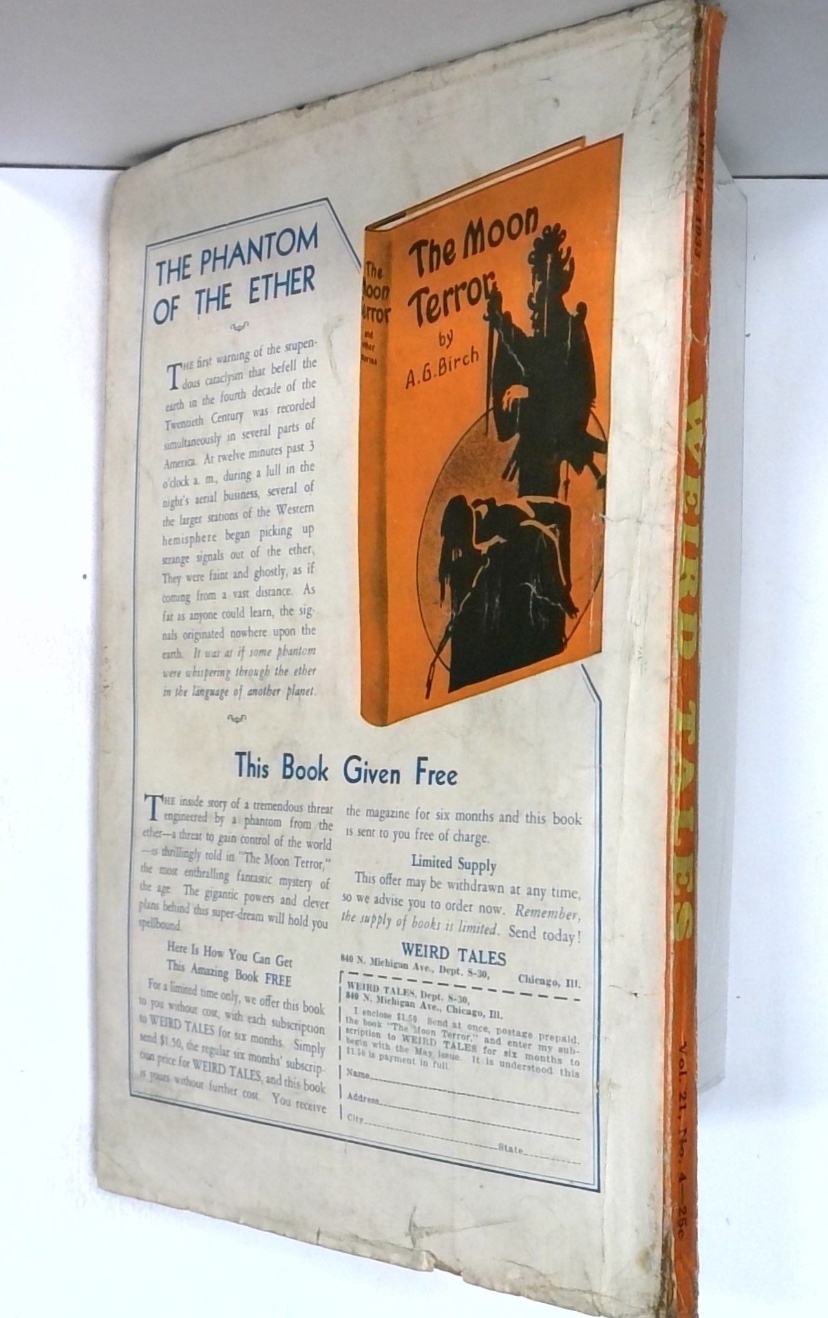 Volume 21, Issue 4 - April 1933. Edited by Farnsworth Wright. Horror and Fantasy stories in the pulp style. 6.75-in. x 10-in.; 128 newsprint pages, text (with B&W illustrations). Cover price $0.25.