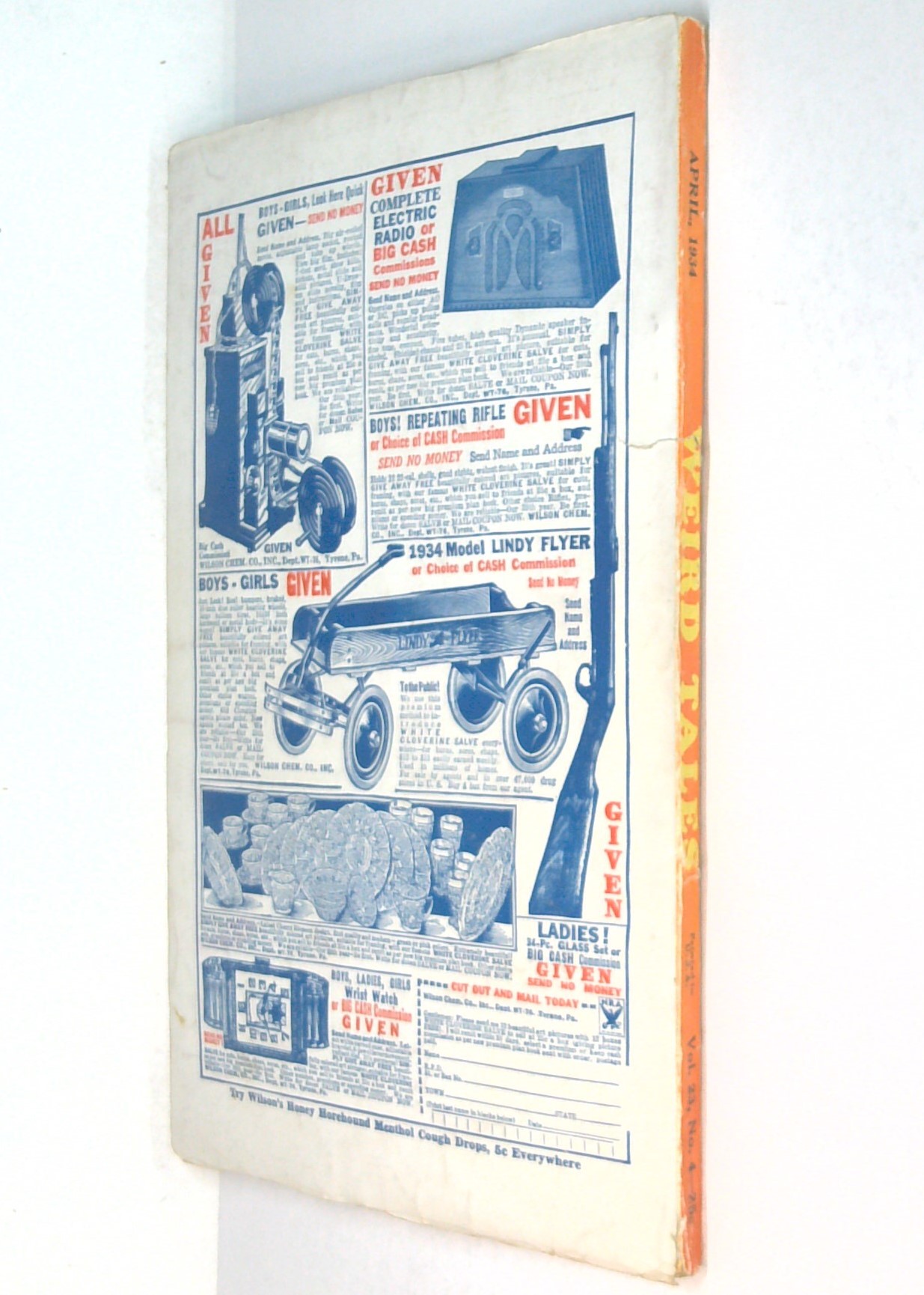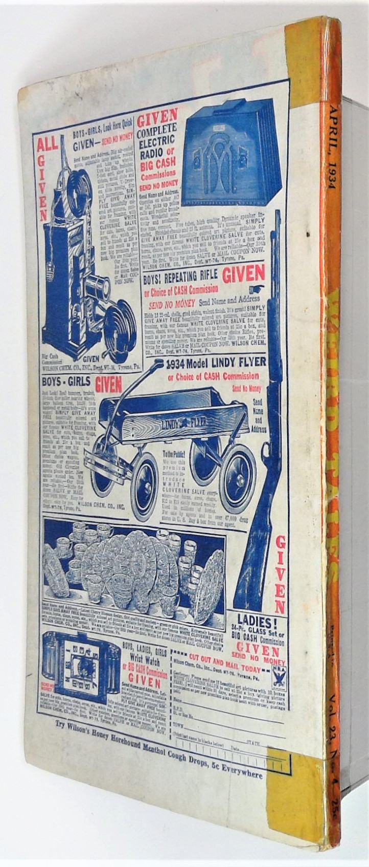 Volume 23, Issue 4 - April 1934. Edited by Farnsworth Wright. Horror and Fantasy stories in the pulp style. 6.75-in. x 10-in.; 128 newsprint pages, text (with B&W illustrations). Cover price $0.25.