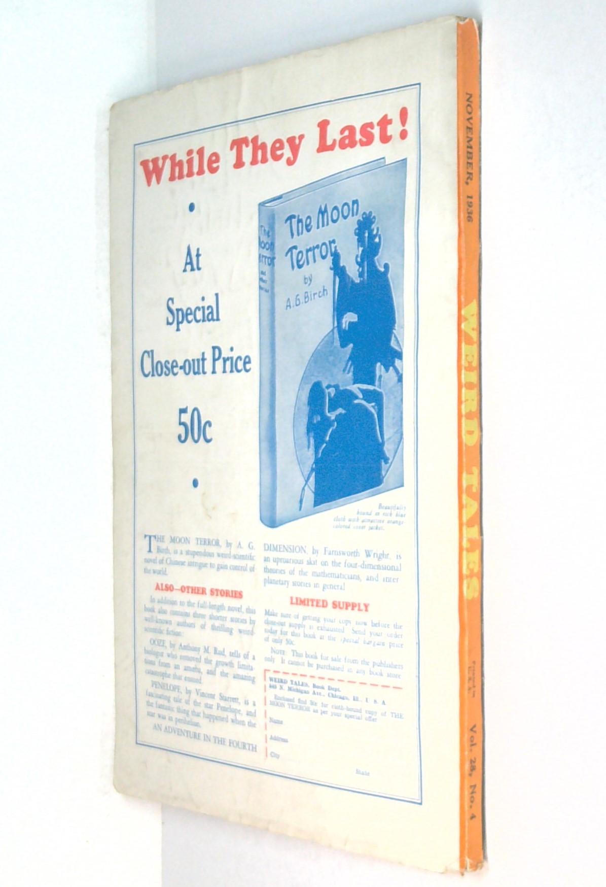 Volume 28, Issue 4 - November 1936. Edited by Farnsworth Wright. Horror and Fantasy stories in the pulp style. 6.75-in. x 10-in.; 128 newsprint pages, text (with B&W illustrations). Cover price $0.25.