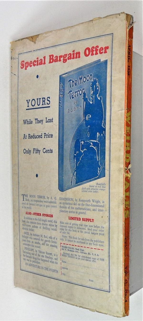 Volume 31, Issue 4 - April, 1938. Edited by Farnsworth Wright. Horror and Fantasy stories in the pulp style. 6.75-in. x 10-in.; 128 newsprint pages, text (with B&W illustrations). Cover price $0.25.