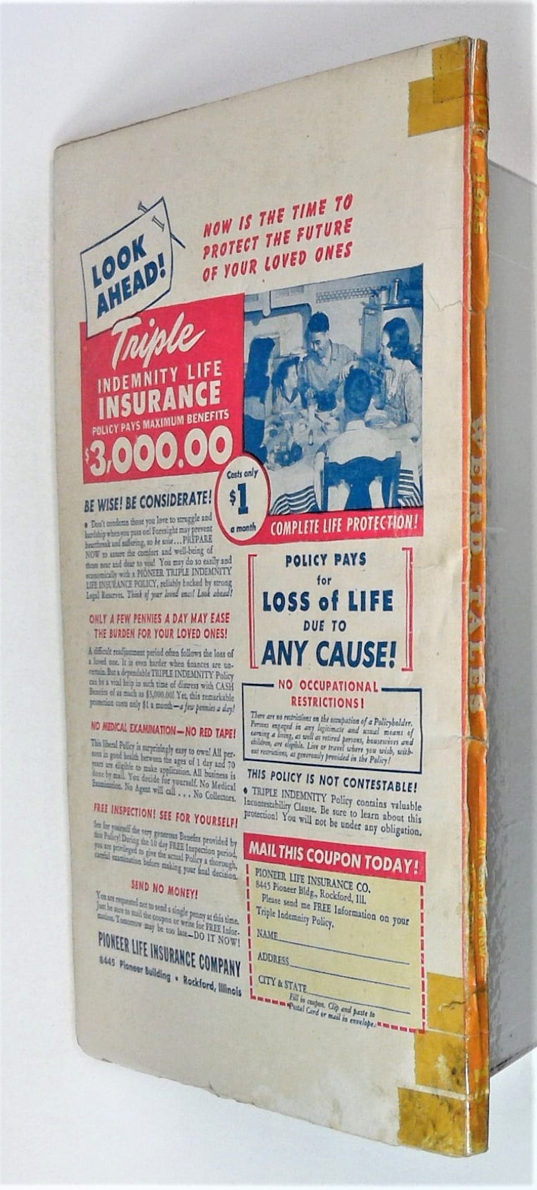 - Front cover detached 15%. Back cover detached 20%. Water damage: Slight. Staple rust: Moderate.