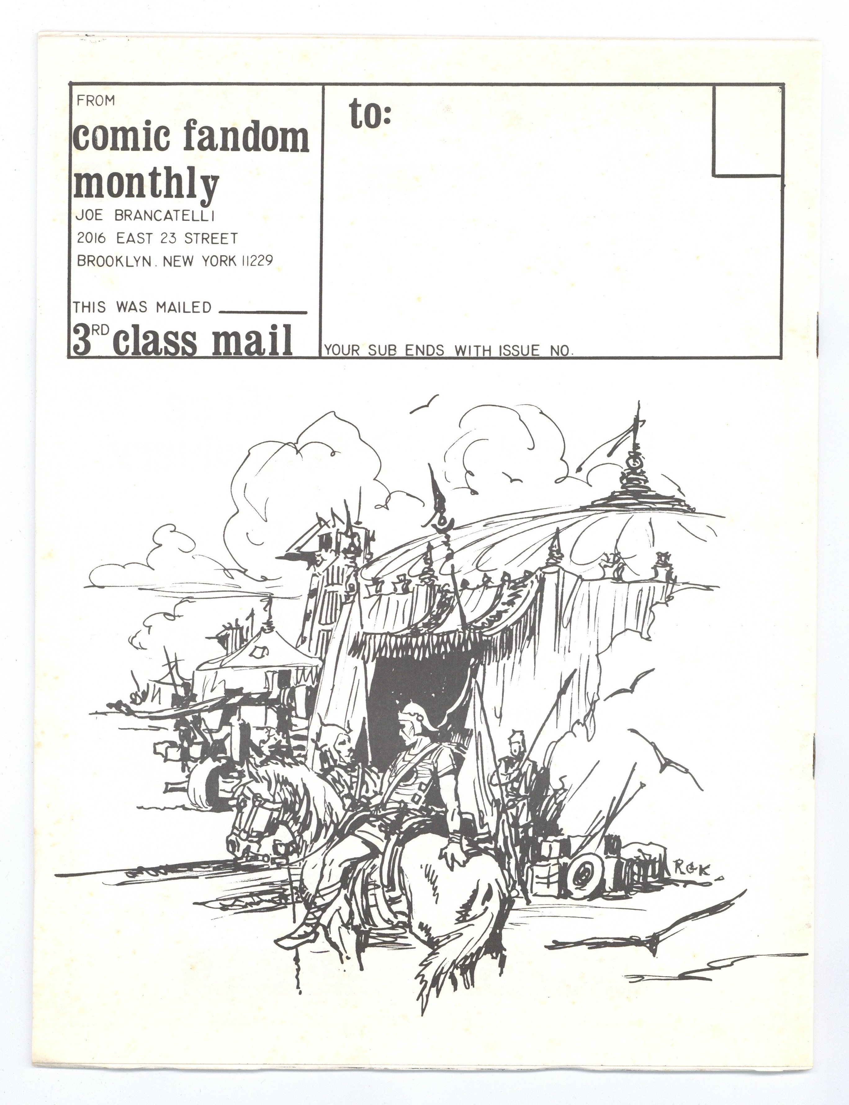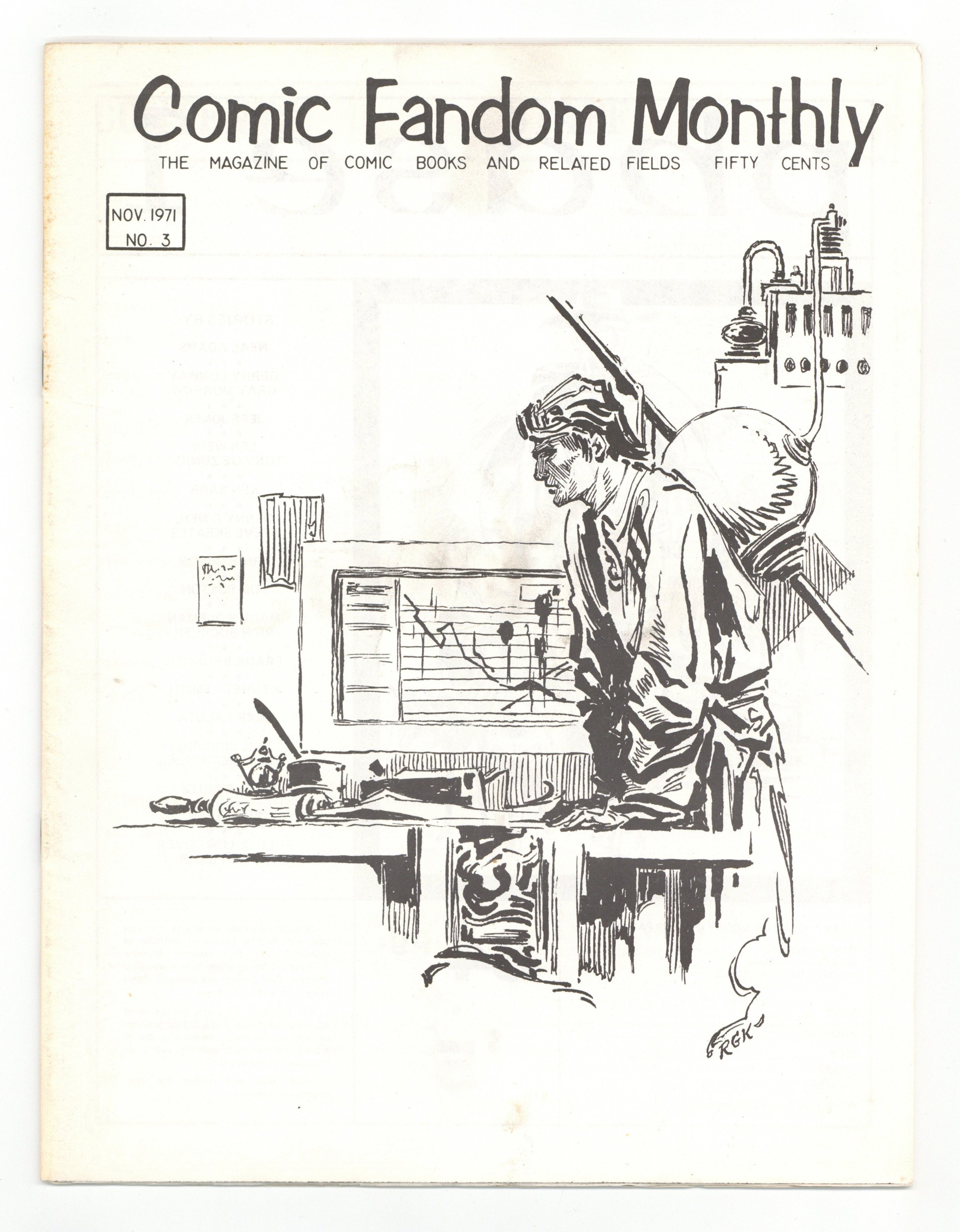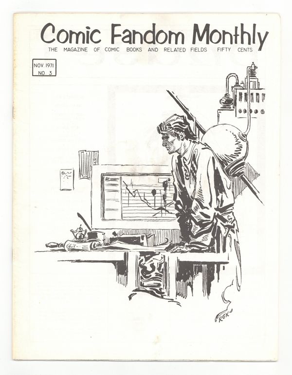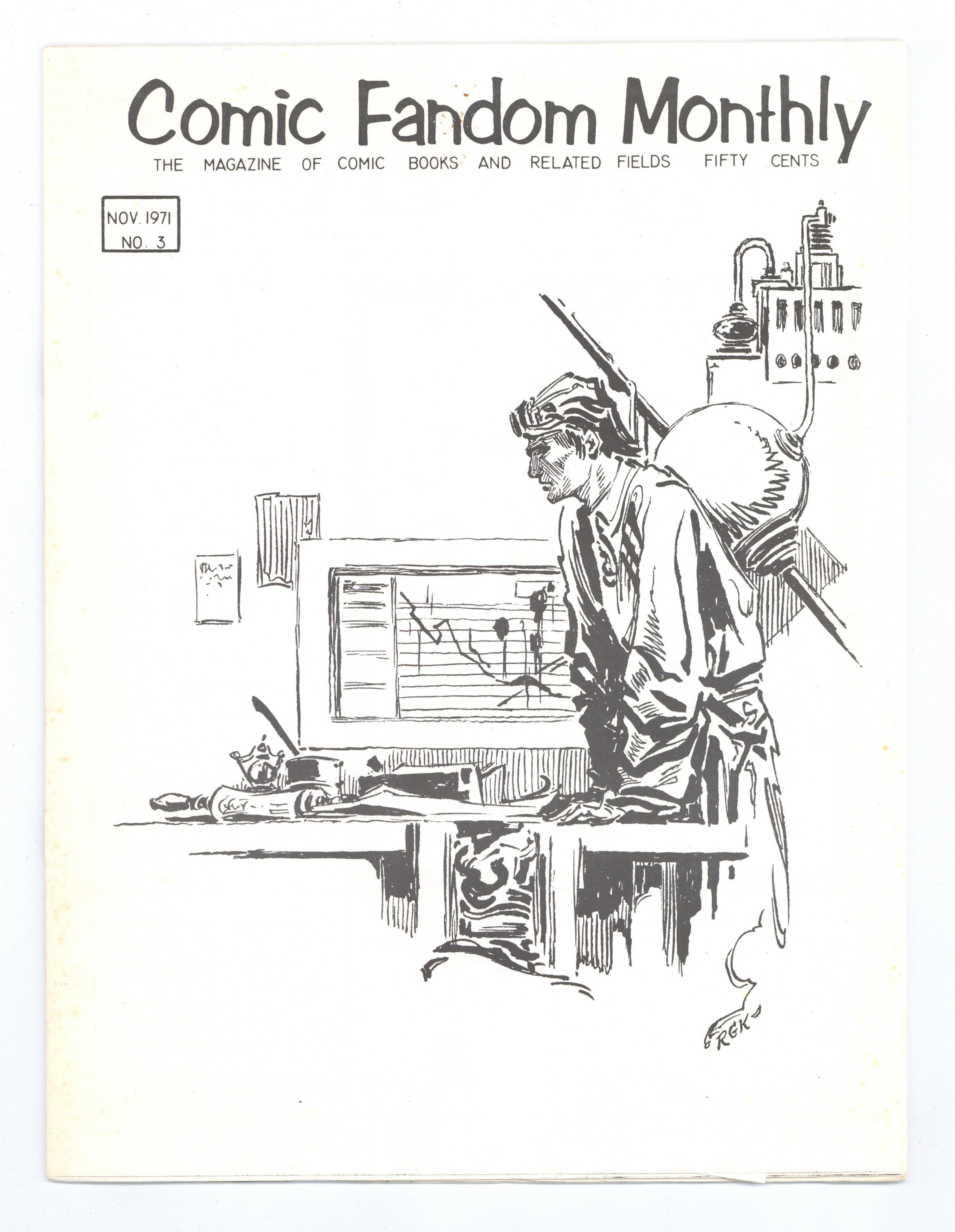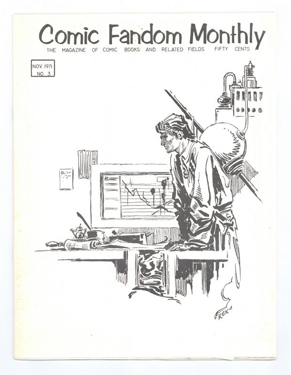 Articles and opinions about the world of comics. Cover by Roy G. Krenkel. This issue features "75 Years of the Comics" by Joe Brancatelli, "Drugs and Comics" by Tony Isabella, plus more. Illustration credits to Roy G. Krenkel, Cliff Letovsky & Bob Pinaha; 8 1/2-in. x 11-in., black and white, 32 pages. Cover price $0.50.