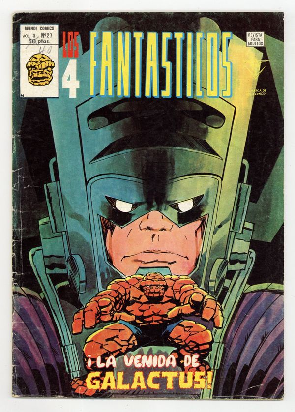 Spanish Series. This issue reprints material from Fantastic Four (1961 1st Series) #47-49 Story by Stan Lee. Art by Jack Kirby/Joe Sinnott art. Cover by R. Lopez Espi. Also includes a story from Adventures into Terror (1951) #7 Art by Joe Maneely. 44 pages, B&W, 7.5" x 10.5", Spanish language. NOTE: #48 (1st appearance Galactus and Silver Surfer). #49 (Partial 2nd appearance Galactus and Silver Surfer)
