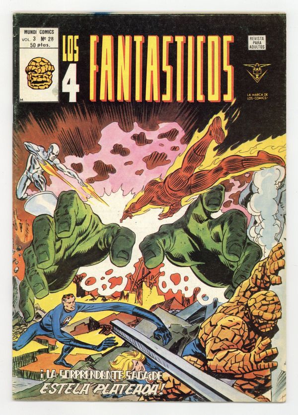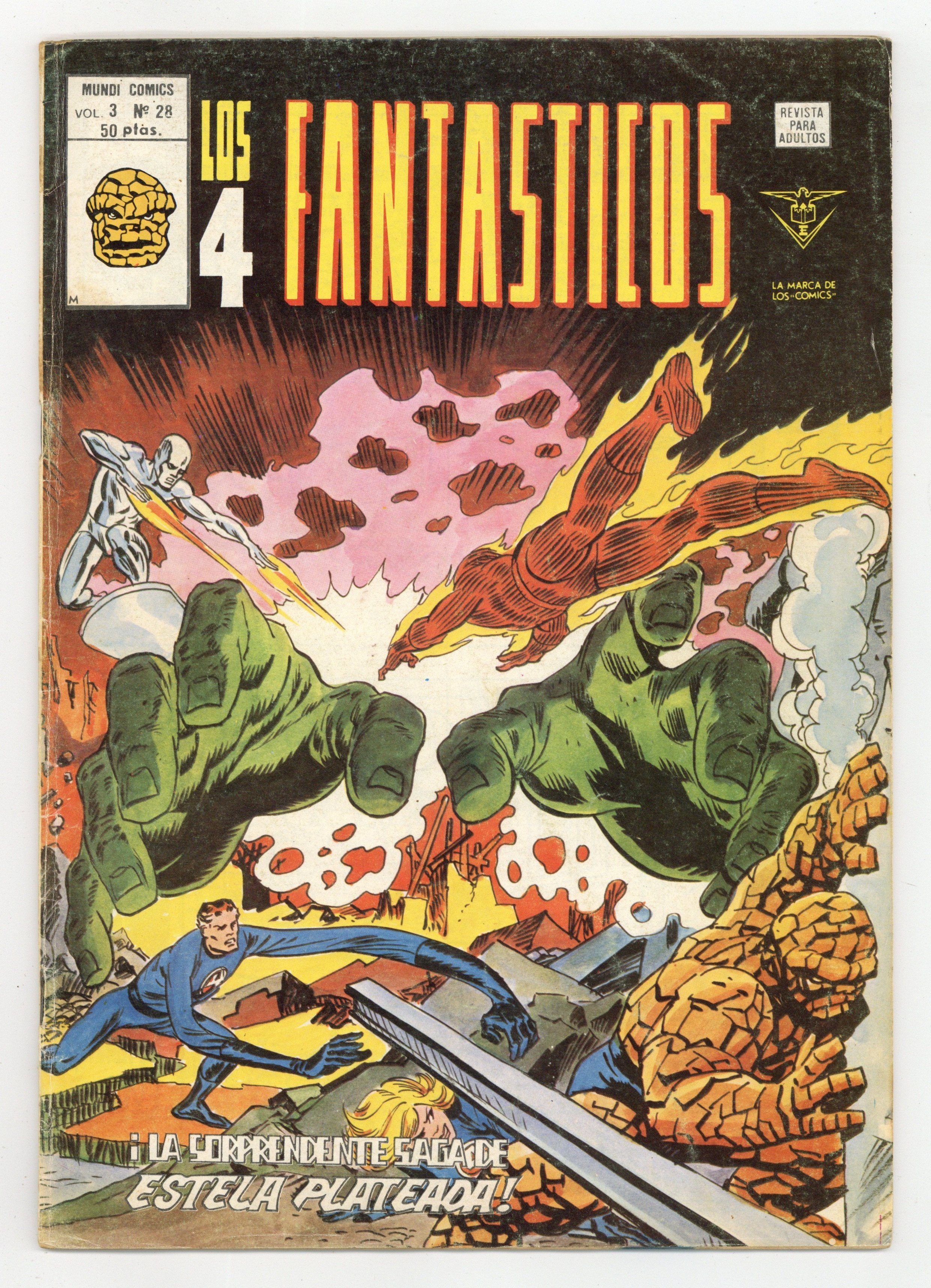 Spanish Series. This issue reprints material from Fantastic Four (1961 1st Series) #49-50 Story by Stan Lee. Art by Jack Kirby/Joe Sinnott art. Cover by R. Lopez Espi. 44 pages, B&W, 7.5" x 10.5", Spanish language. NOTE: #49 (Partial 2nd appearance Galactus and Silver Surfer). #50 (1st appearance Wyatt Wingfoot)