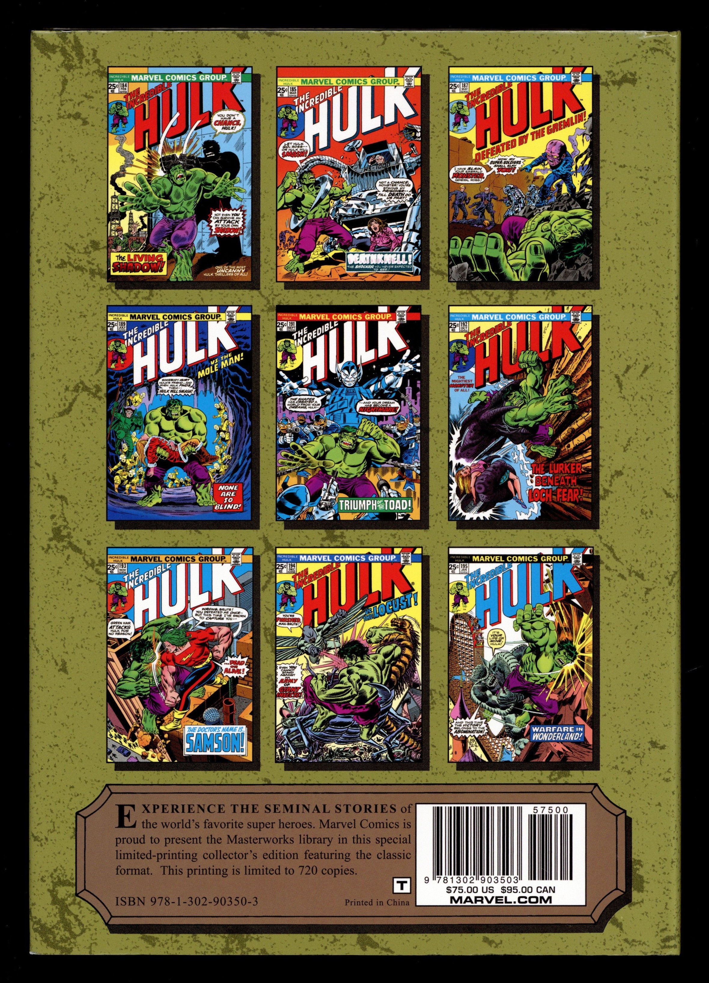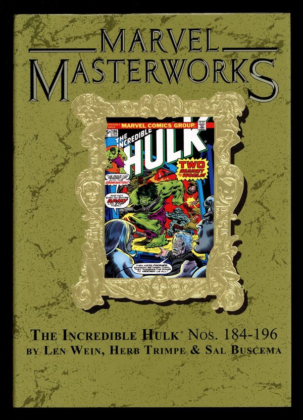 Volume 252 - 1st printing. "Incredible Hulk: Book 11!" Collects Incredible Hulk (1962-1999 1st Series) #184-196 and material from Giant Size Hulk (1975 1st Series) #1 and Marvel Treasury Edition (1974) #5. Written by Len Wein and Gary Friedrich. Art by Herb Trimpe, Sal Buscema, and Marie Severin. Cover by Gil Kane. Hulk is the strongest! Why? Because it's hard not to be when you go from strength to strength with artists Herb Trimpe and Sal Buscema! Trimpe defined the Incredible Hulk in an artistic tenure stretching from 1968 to 1975. When Sal Buscema took over the reins, not only did the series gain a great talent, but one that, unbelievably, would have a tenure longer than even Trimpe's! Add to that Len Wein writing some of his greatest Hulk stories, and you've got a bona fide Marvel Masterworks! The adventures include Hulk smashing his way through the Mole Man, the Gremlin, the Shaper of Worlds, Doc Samson, the Abomination...and, of course, the never-ending military machinations of Gen. Thunderbolt Ross! Hardcover, 272 pages, full color. Cover price $75.00.