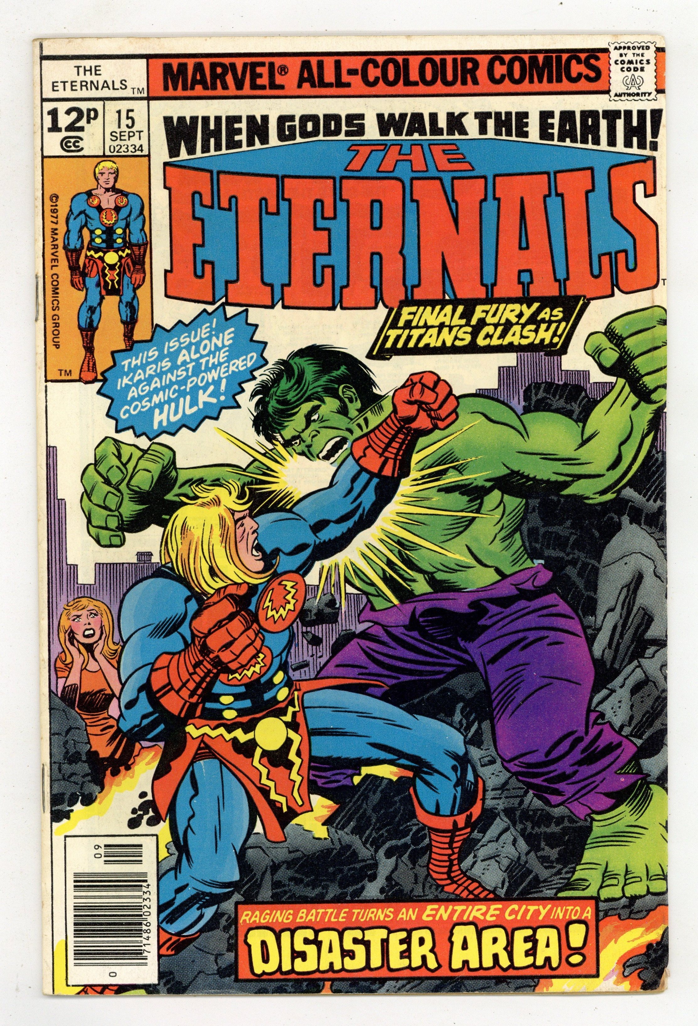 $50.00UK edition. Identical to US edition, but has 12p cover price.. "Disaster Area." Written by Jack Kirby. Pencils by Jack Kirby. Inks by Mike Royer. The battle between Ikaris and the cosmic-powered Hulk continues! But as these two immensely powerful warriors threatens to topple the city around them. Can even Ikaris contain the fury of the Cosmic Hulk?!