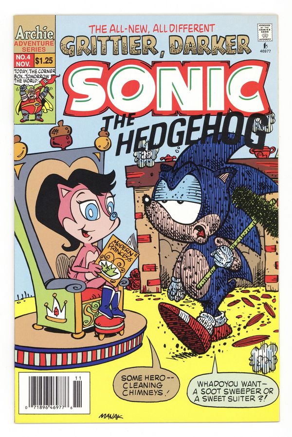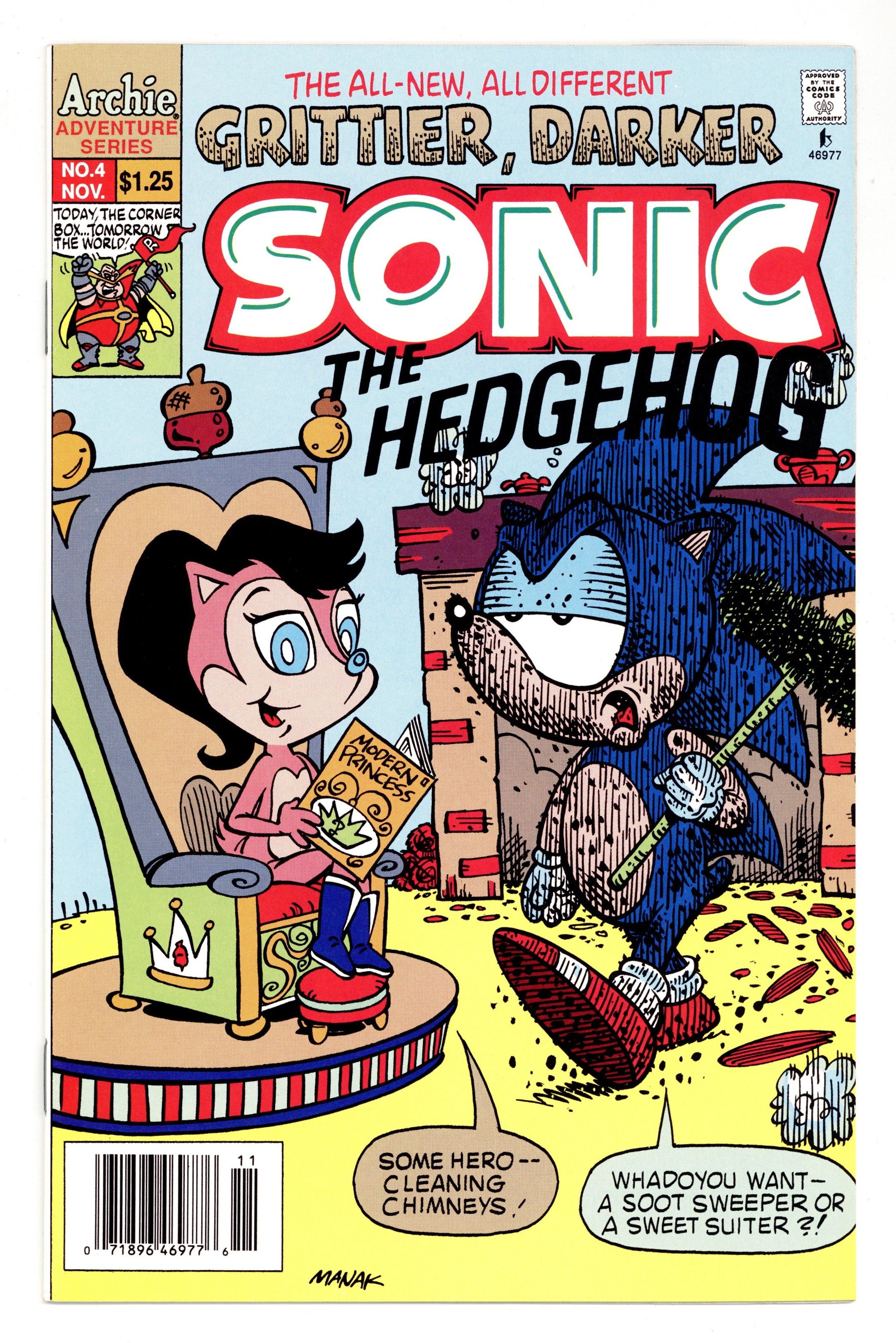 Published Nov 1993 by Archie Publications.$39.00Cover art by Dave Manak. The Lizard Of Odd; Dr. Robotnik roboticizes a small lizard into a towering menace bent on destroying Sonic. Antoine's Vain Refrain. Horizont Al & Verti Cal. Bad-Niks Bazaar. Hair Styling. Tails' Little Tale; Tails tries to destroy one of Dr. Robotnik's factories without help from Sonic. Scripts by Michael Gallagher, pencils by Dave Manak, inks by Scripts by Michael Gallagher, pencils by Dave Manak, inks by Jon D'Agostino. Robotnik Birthday Card, art by Manak. Super Sonic Pin-Up, art by Manak. Inspired by the Sega Genesis videogame. 32 pgs. $1.25. Cover price $1.25.