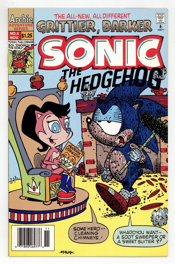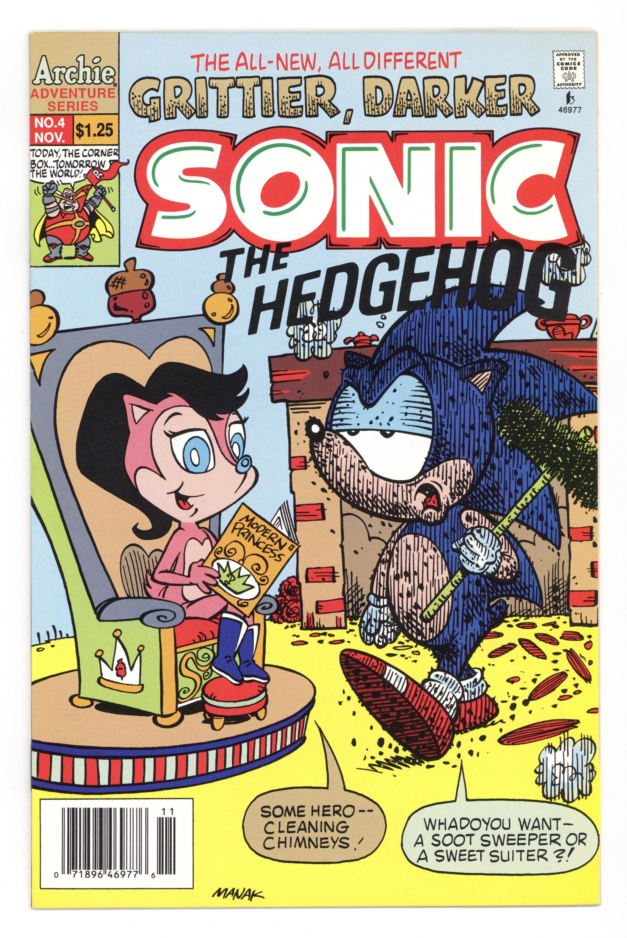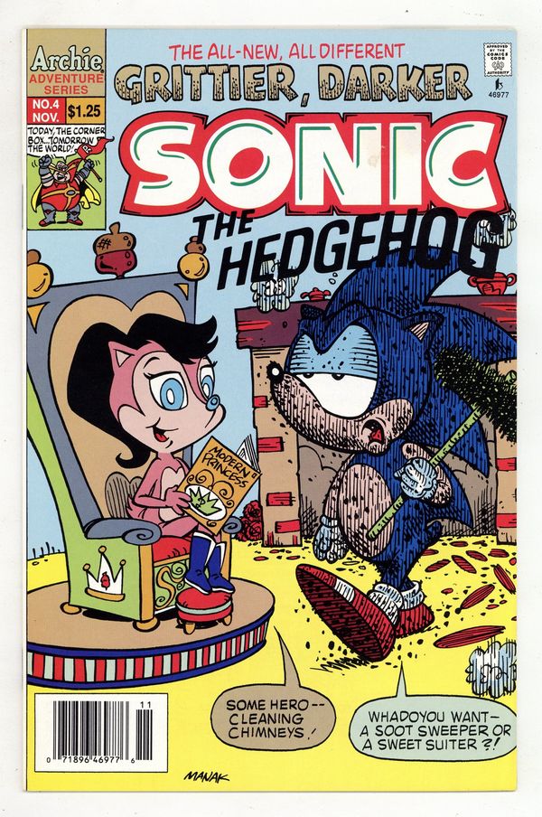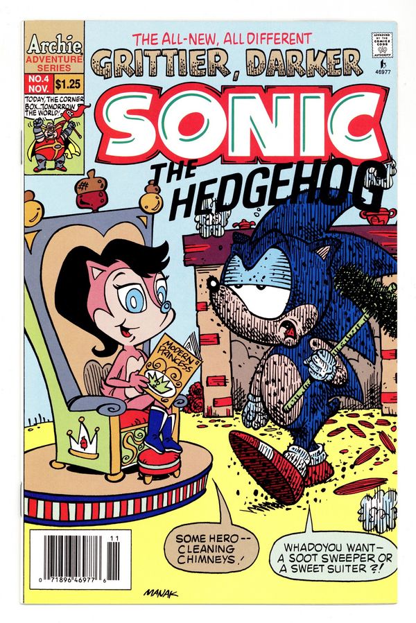 Published Nov 1993 by Archie Publications.$42.00Cover art by Dave Manak. The Lizard Of Odd; Dr. Robotnik roboticizes a small lizard into a towering menace bent on destroying Sonic. Antoine's Vain Refrain. Horizont Al & Verti Cal. Bad-Niks Bazaar. Hair Styling. Tails' Little Tale; Tails tries to destroy one of Dr. Robotnik's factories without help from Sonic. Scripts by Michael Gallagher, pencils by Dave Manak, inks by Scripts by Michael Gallagher, pencils by Dave Manak, inks by Jon D'Agostino. Robotnik Birthday Card, art by Manak. Super Sonic Pin-Up, art by Manak. Inspired by the Sega Genesis videogame. 32 pgs. $1.25. Cover price $1.25.