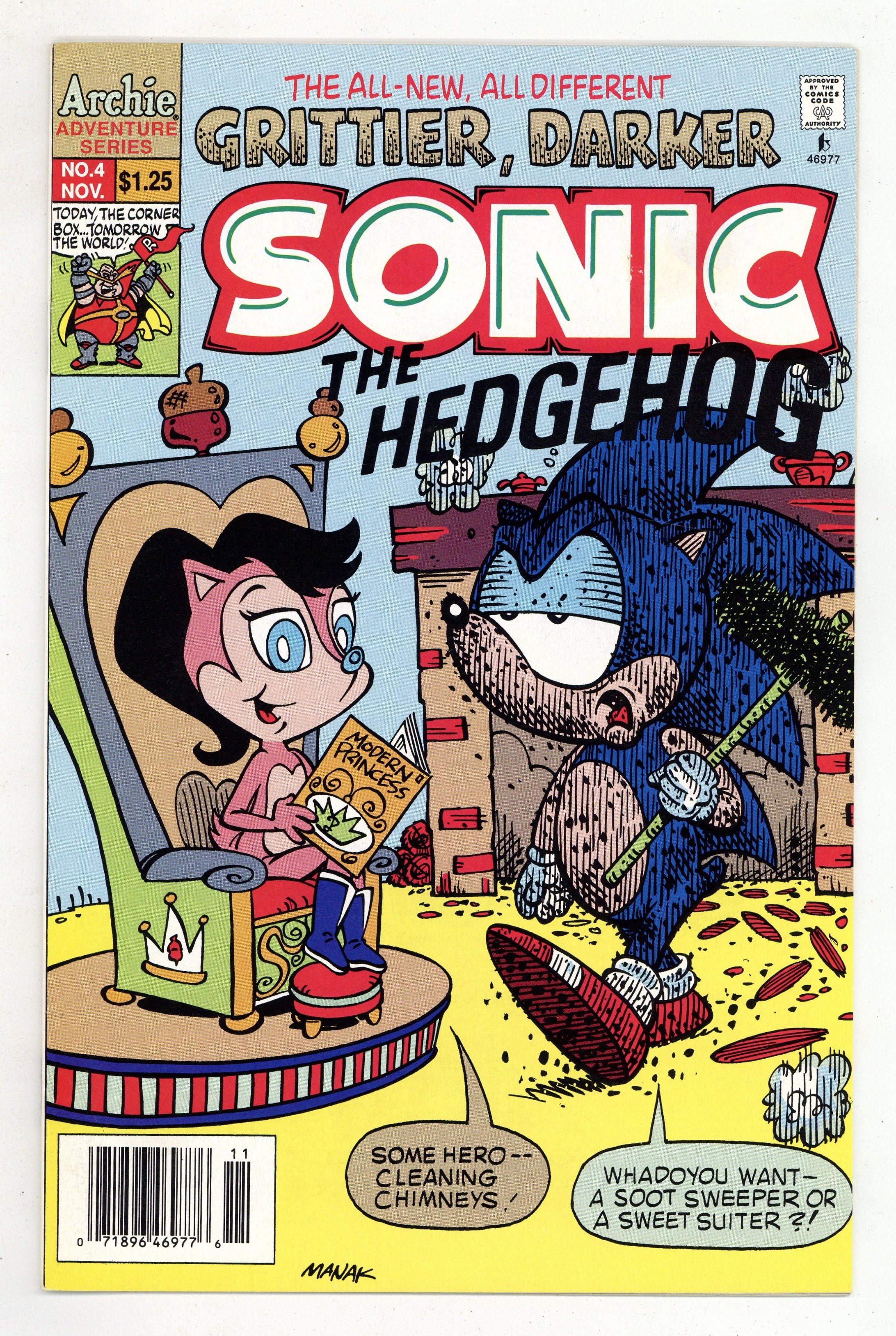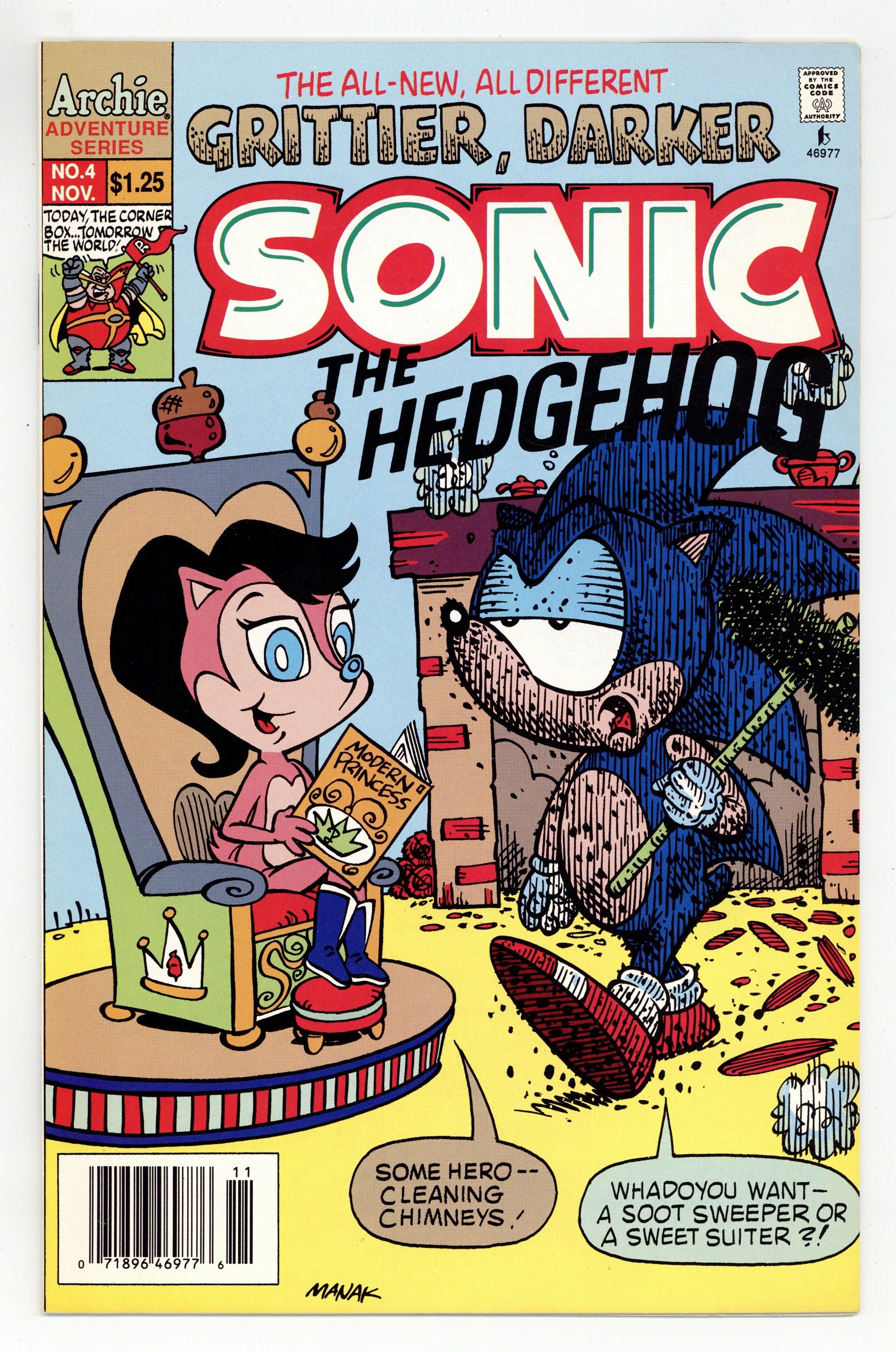 Published Nov 1993 by Archie Publications.$30.00Cover art by Dave Manak. The Lizard Of Odd; Dr. Robotnik roboticizes a small lizard into a towering menace bent on destroying Sonic. Antoine's Vain Refrain. Horizont Al & Verti Cal. Bad-Niks Bazaar. Hair Styling. Tails' Little Tale; Tails tries to destroy one of Dr. Robotnik's factories without help from Sonic. Scripts by Michael Gallagher, pencils by Dave Manak, inks by Scripts by Michael Gallagher, pencils by Dave Manak, inks by Jon D'Agostino. Robotnik Birthday Card, art by Manak. Super Sonic Pin-Up, art by Manak. Inspired by the Sega Genesis videogame. 32 pgs. $1.25. Cover price $1.25.
